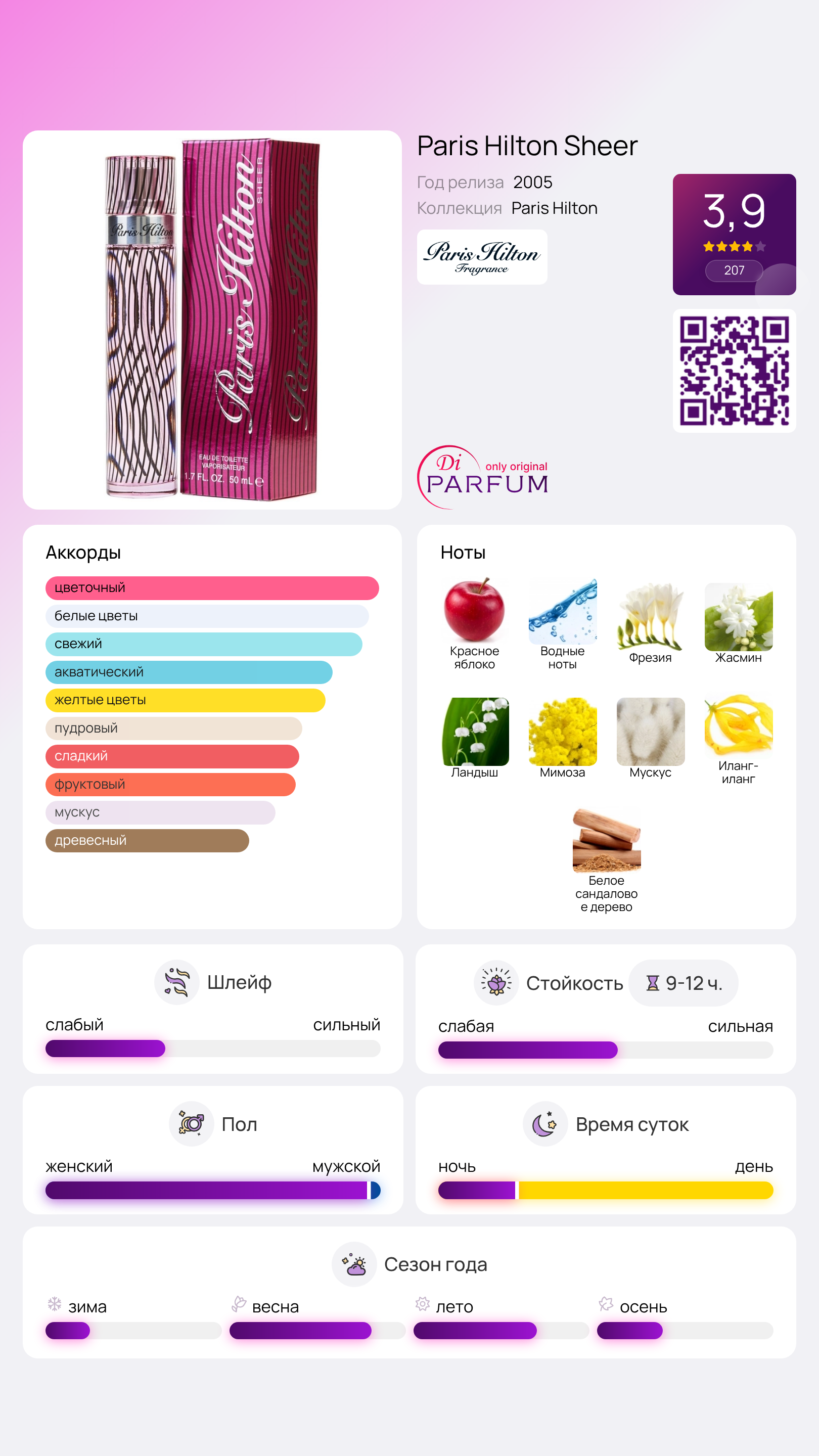 Аромат Paris Hilton Sheer от одноименной марки выбирают уверенные в своих силах, привлекательные и умные женщины. Они способны на всё, и достижение целей становится их главным принципом жизни. Эти девушки одерживают победы как в личной жизни, так и в профессиональной сфере.