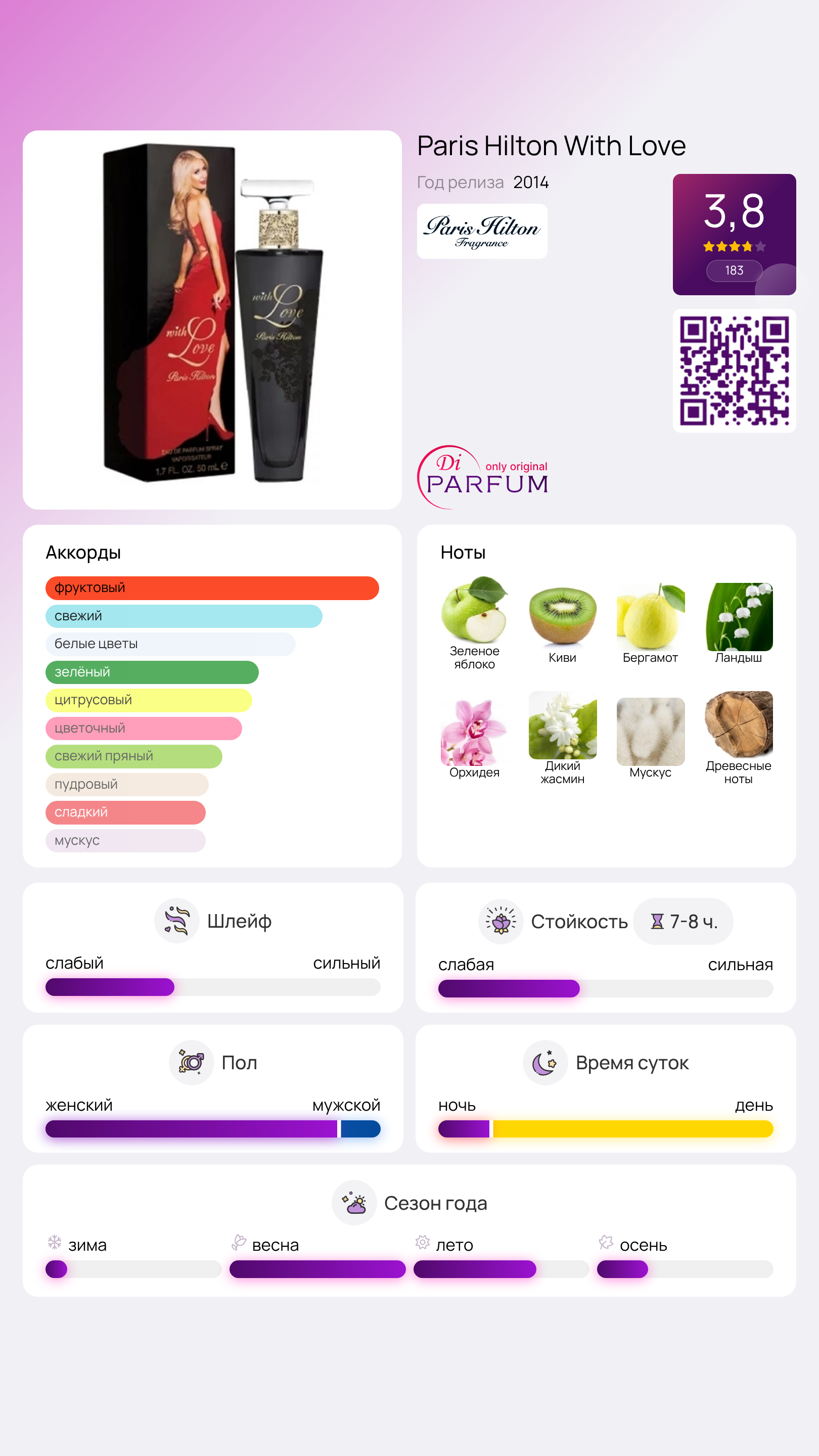 Ароматическая композицияWith Love, созданная модным домом Paris Hilton в 2014 году, сочетает в себе фруктово-цветочные ноты, которые могут заинтересовать даже самых стойких мужчин, так же как сама дизайнерша. Работу над этим утонченным и роскошным парфюмом осуществил талантливый парфюмер Гарри Фремонт, известный своими выразительными и элегантными творениями.