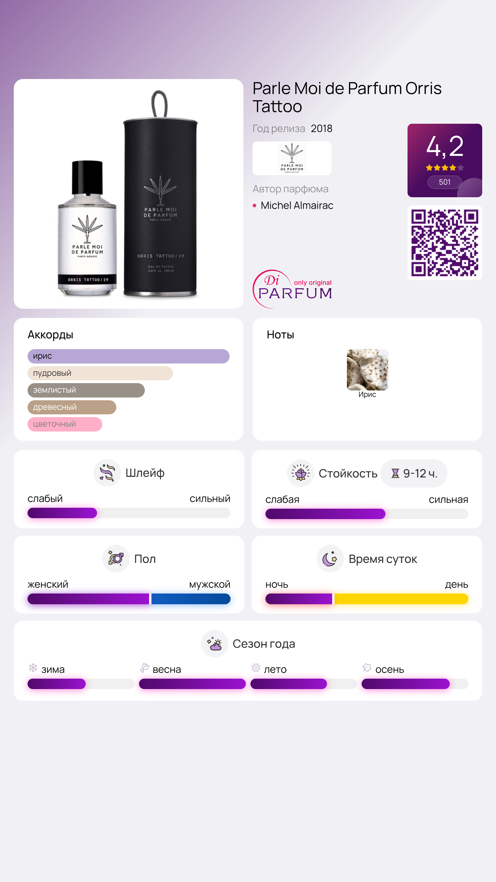Orris Tatoo от Parle Moi De Parfum – это вне временной парфюм. Он подходит для любого времени суток, актуален в любой эпохе и прекрасен для любого повода.