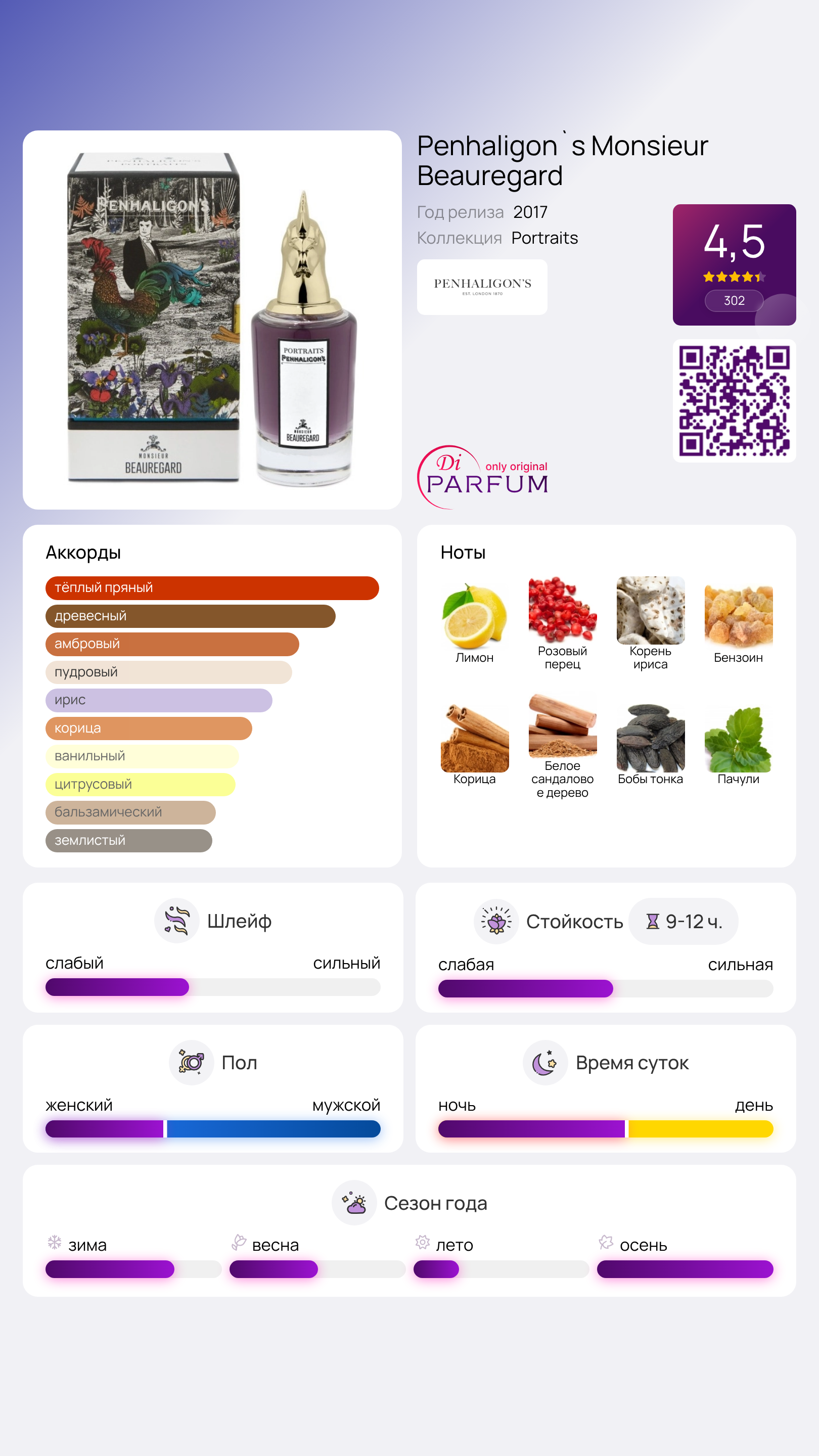 Monsieur Beauregard, с его бальзамическим, древесным и элегантным характером, встречает гостей свежестью розового перца и кисловатым лимоном. В сердце аромата объединены бензоин, корица и корень ириса, а база очаровывает сливочной нотой сандала, землисто-эфирным акцентом пачули и сладостью бобов тонка.