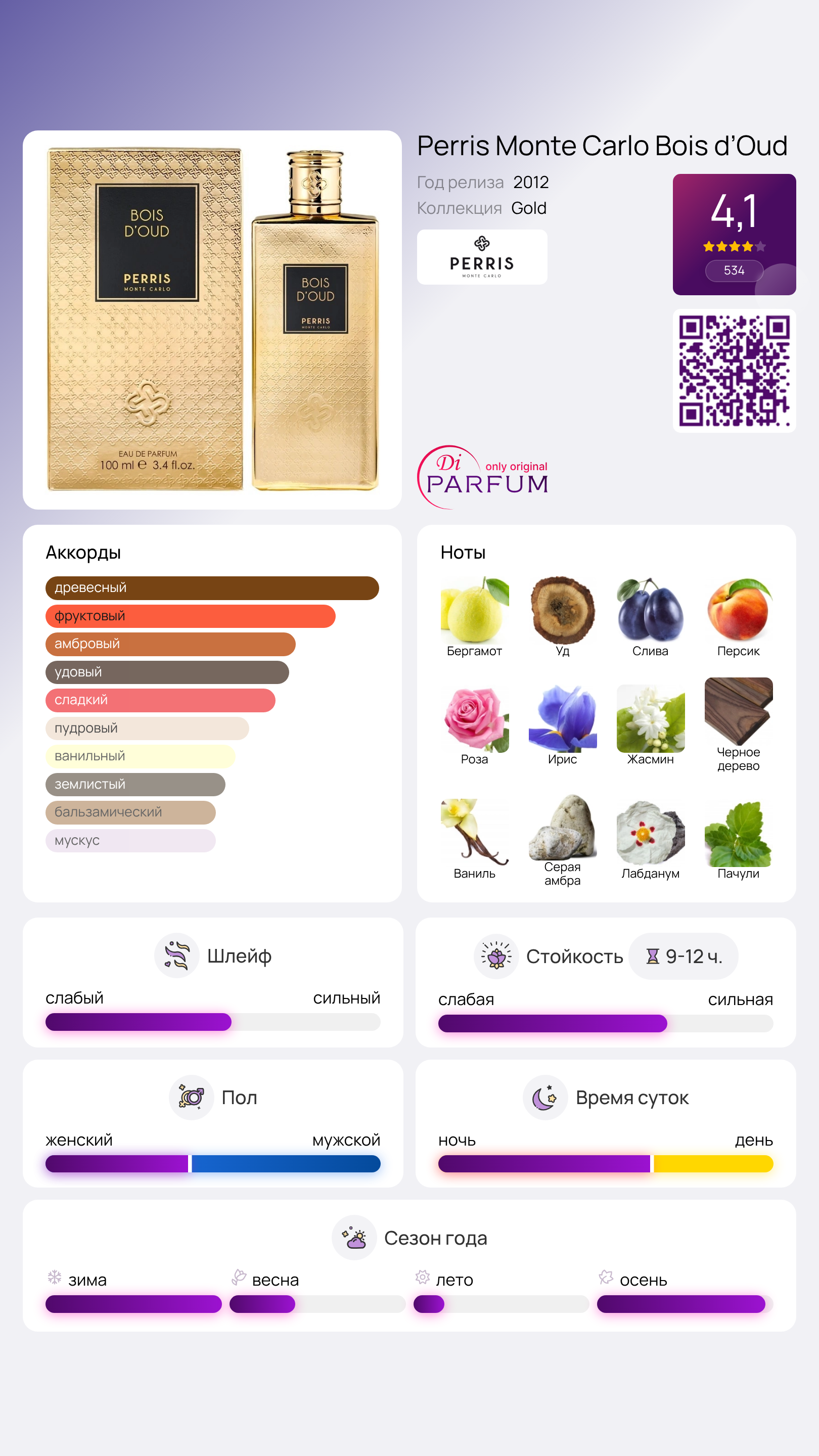 Этот аромат относится к восточному направлению и уже с первых аккордов наполняет эмоциями. Начало аромата освежает бодрящим бергамотом, следом за которым на средних нотах раскрываются цветочные и фруктовые оттенки. Завершающие ноты шлейфа сочетает в себе ваниль, мускус, кедр, ветивер, сандал и великолепный уд, создавая гармоничное завершение композиции.