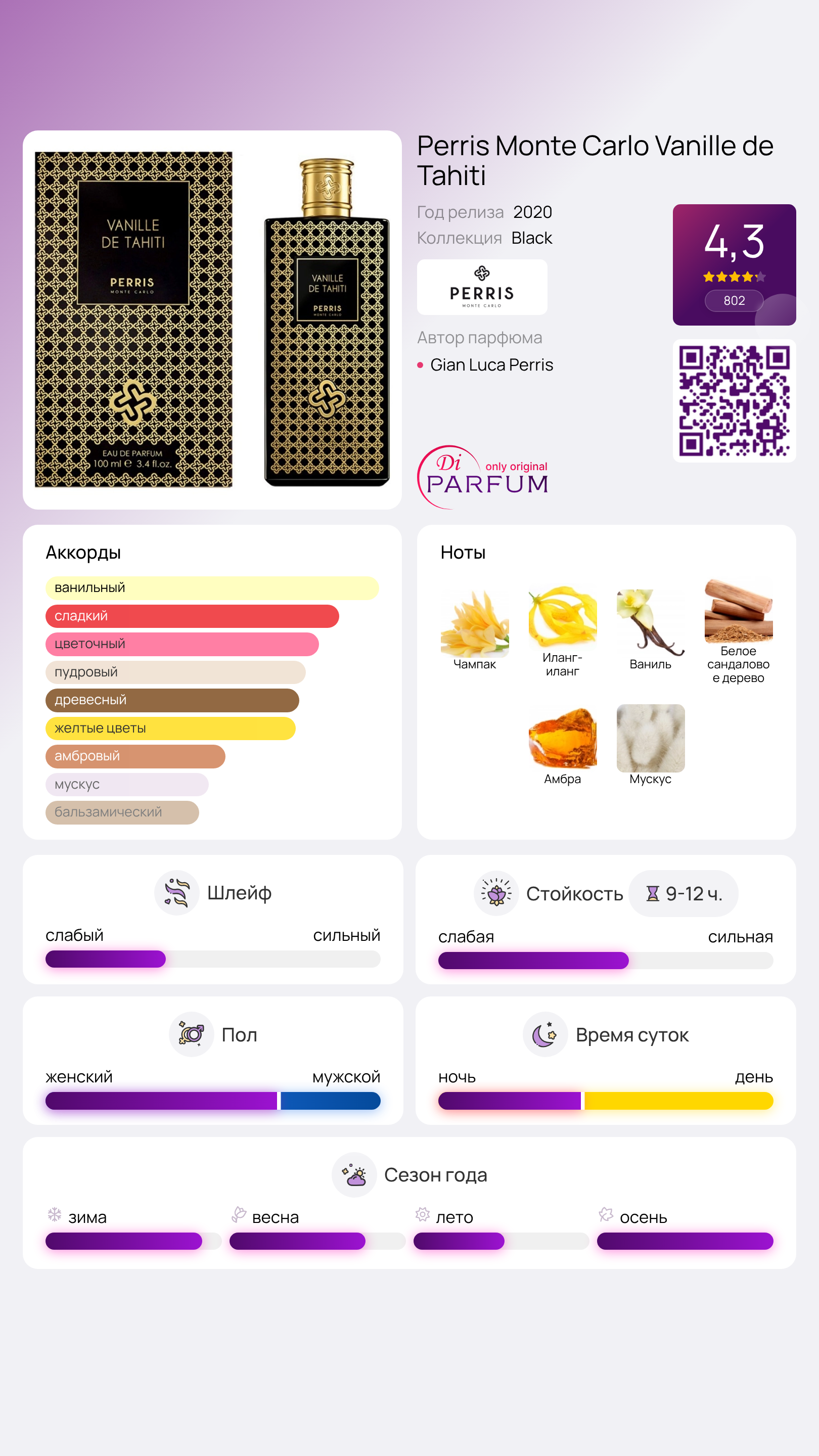 Шлейф этого аромата окутывает восточным шармом, сочетая мускус и янтарь, а также обогащённый сливочными оттенками сандал. Композиция Vanille de Tahiti от Perris Monte Carlo создает ощущение тропической расслабленности. Этот парфюм был выпущен знаменитым брендом из Монако в 2020 году.