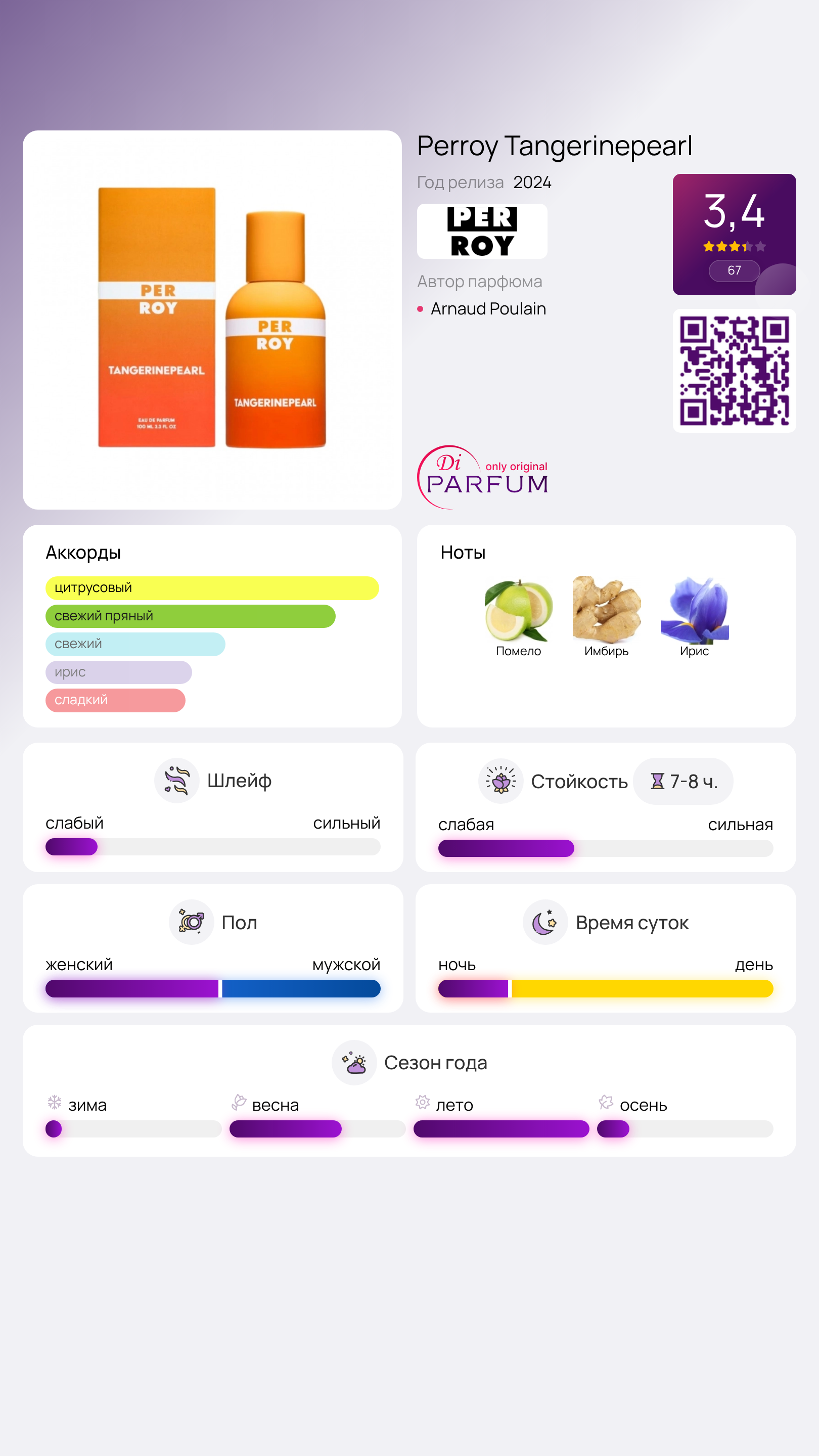 Аромат Perroy Tangerinepearl, яркий и броский как его оранжевый флакон, стал значимым открытием 2024 года. Его разработчик, Арно Пулен, создал ольфакторную пирамиду, основанную на трех нотах, и несмотря на кажущуюся простоту, он предлагает энергичный парфюм, который способен сделать любой серый день более ярким.