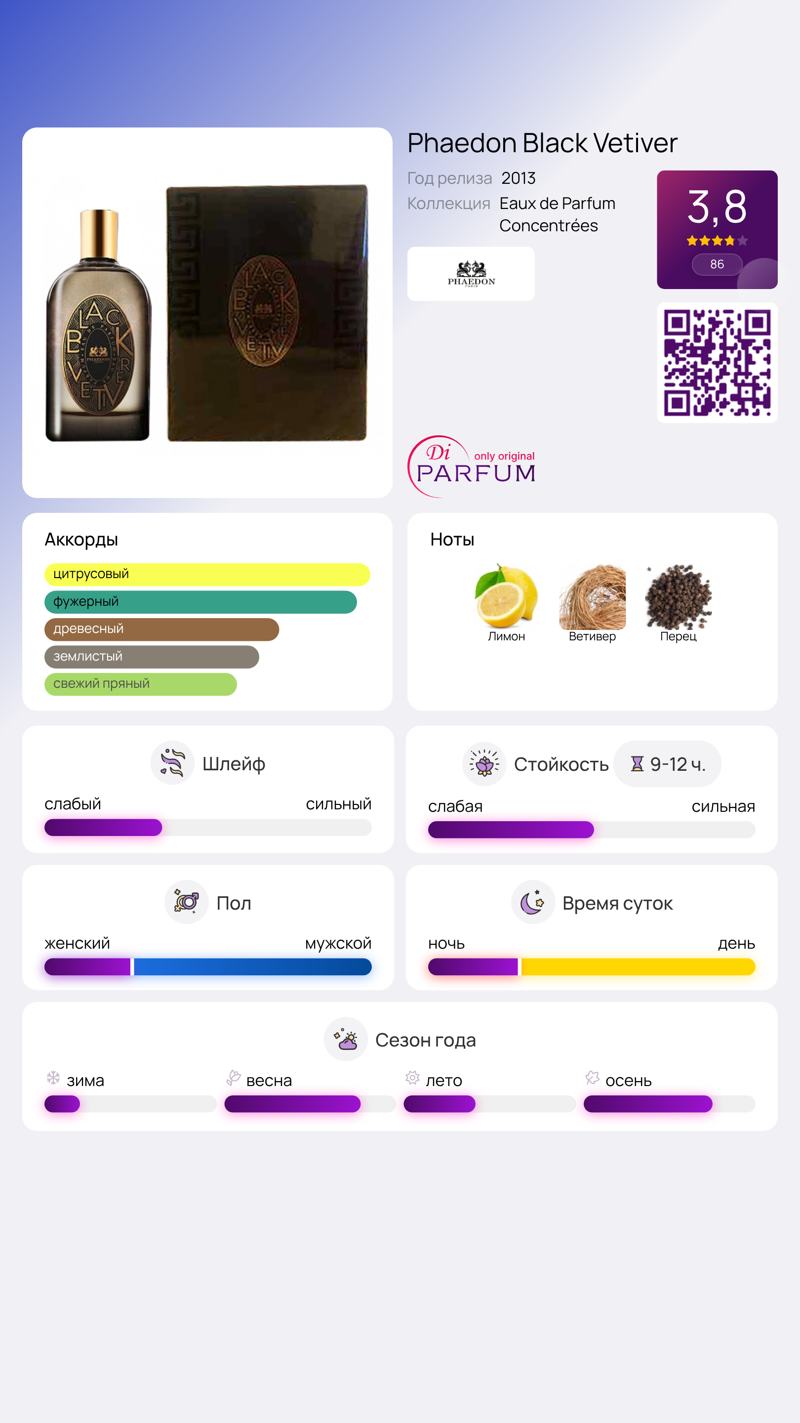 Смесь трав и цитрусовых аккордов наполняет уверенность, проявляя настойчивость в основе Phaedon Black Vetiver, и оставляет после себя чистый и мощный шлейф на протяжении всего дня.