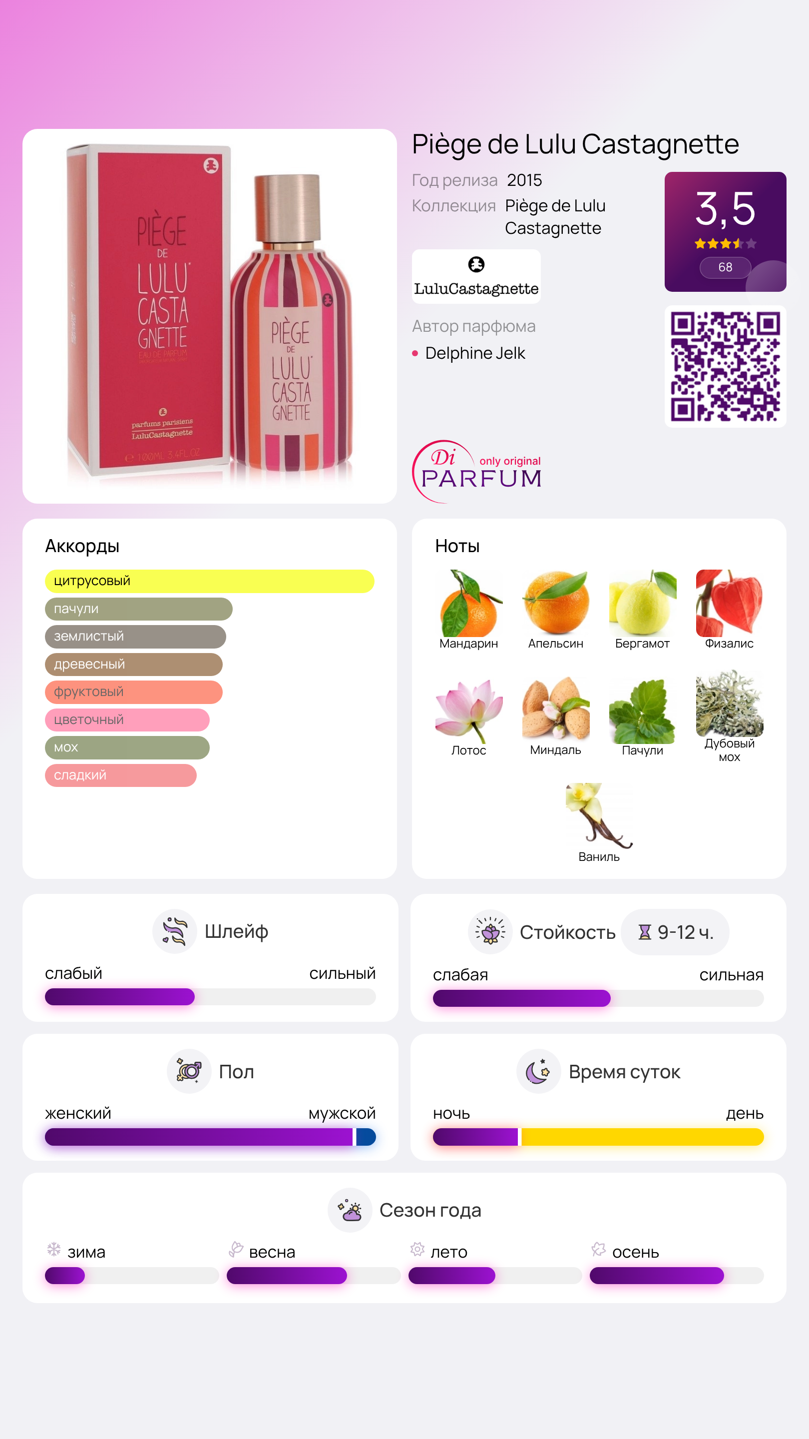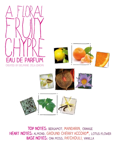 Ароматный шипрово-фруктовый букет Piege de Lulu Castagnette вдохновляет в духе Мисс Диор. Это выразительный шипр, в котором присутствует горький миндаль. Главным компонентом является физалис, который призывает наслаждаться каждым мгновением жизни. Начальные ноты созданы из терпкого бразильского апельсина.