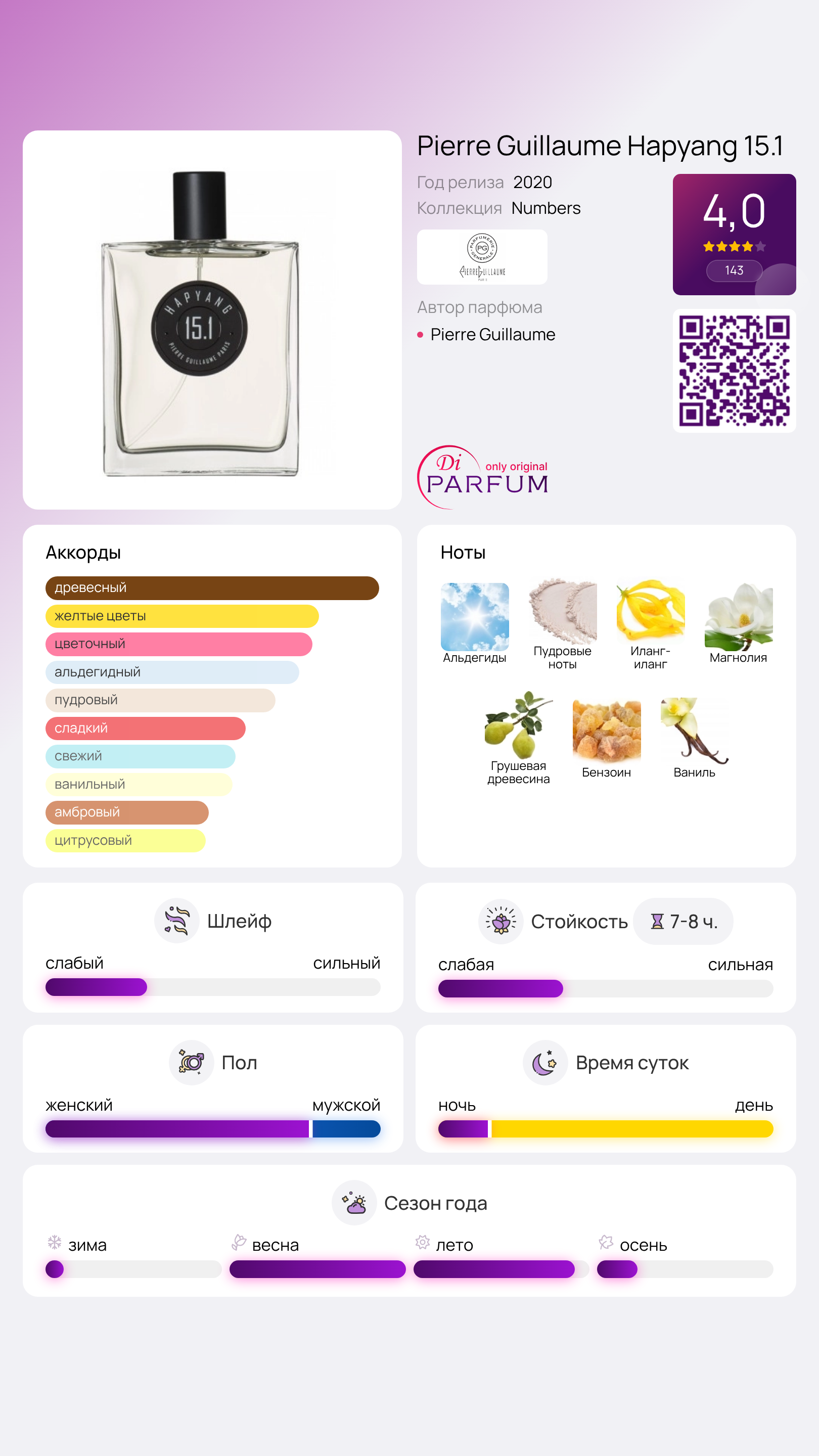 Парфюмерная вода Pierre Guillaume Hapyang 15.1 представляет собой роскошную цветочно-альдегидную композицию, в которой сочетаются пудровые ноты, цветочная сияние и безграничный шлейф. Альдегиды придают экзотическому букету особое очарование, создавая впечатление легкого облака пудры. Идея для создания аромата пришла из рекламы сухих сливок компании FrieslandCampina.