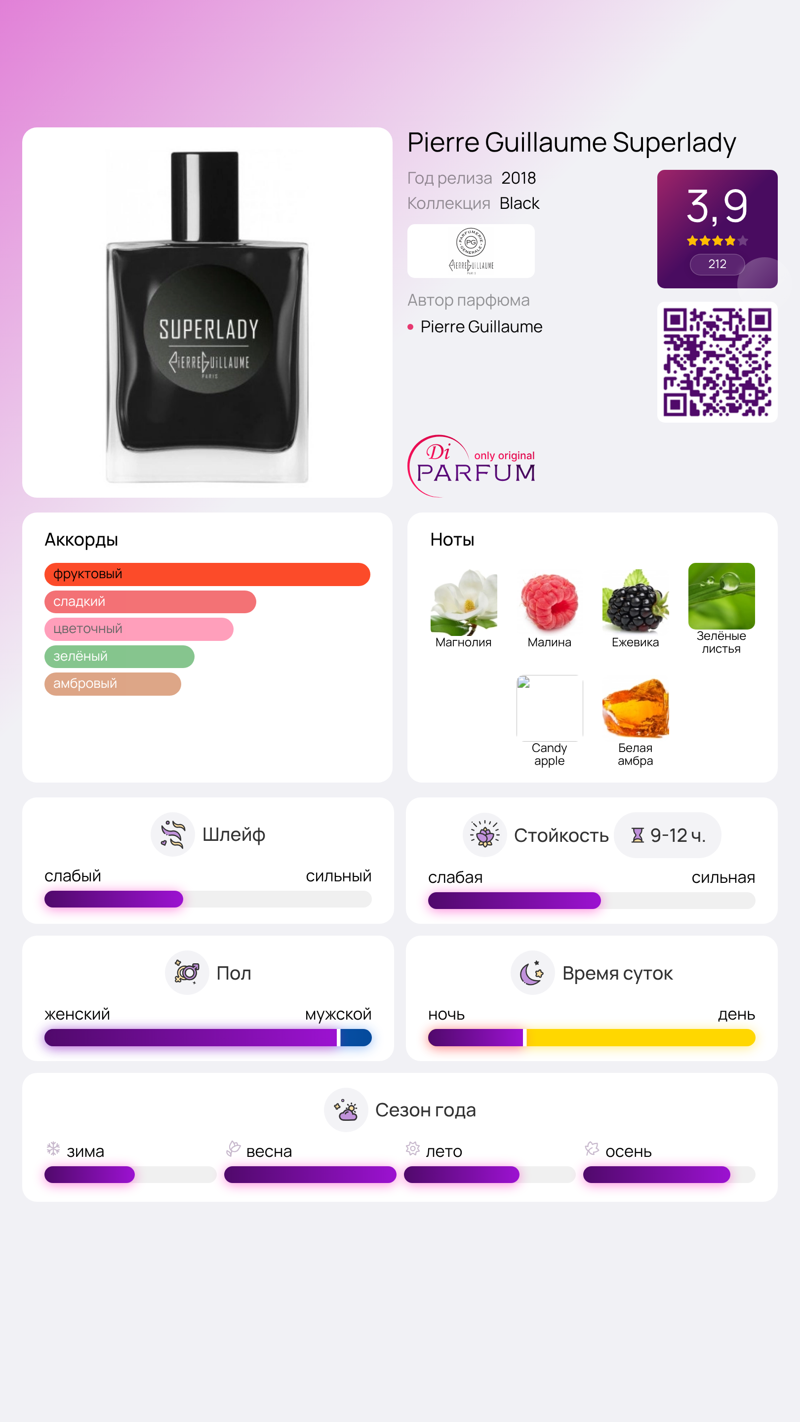 Сердце аромата наполняется сладким вкусом засахаренного яблока в карамели, создавая атмосферу благополучия и радости. Завершает композицию база из страстных нот нежной белой амбры, придающей образу женщины очарование недоступности, а не вульгарности. Pierre Guillaume Superlady создан для сильных, уверенных в себе женщин, которые осознают всю прелесть своей привлекательности и красоты.