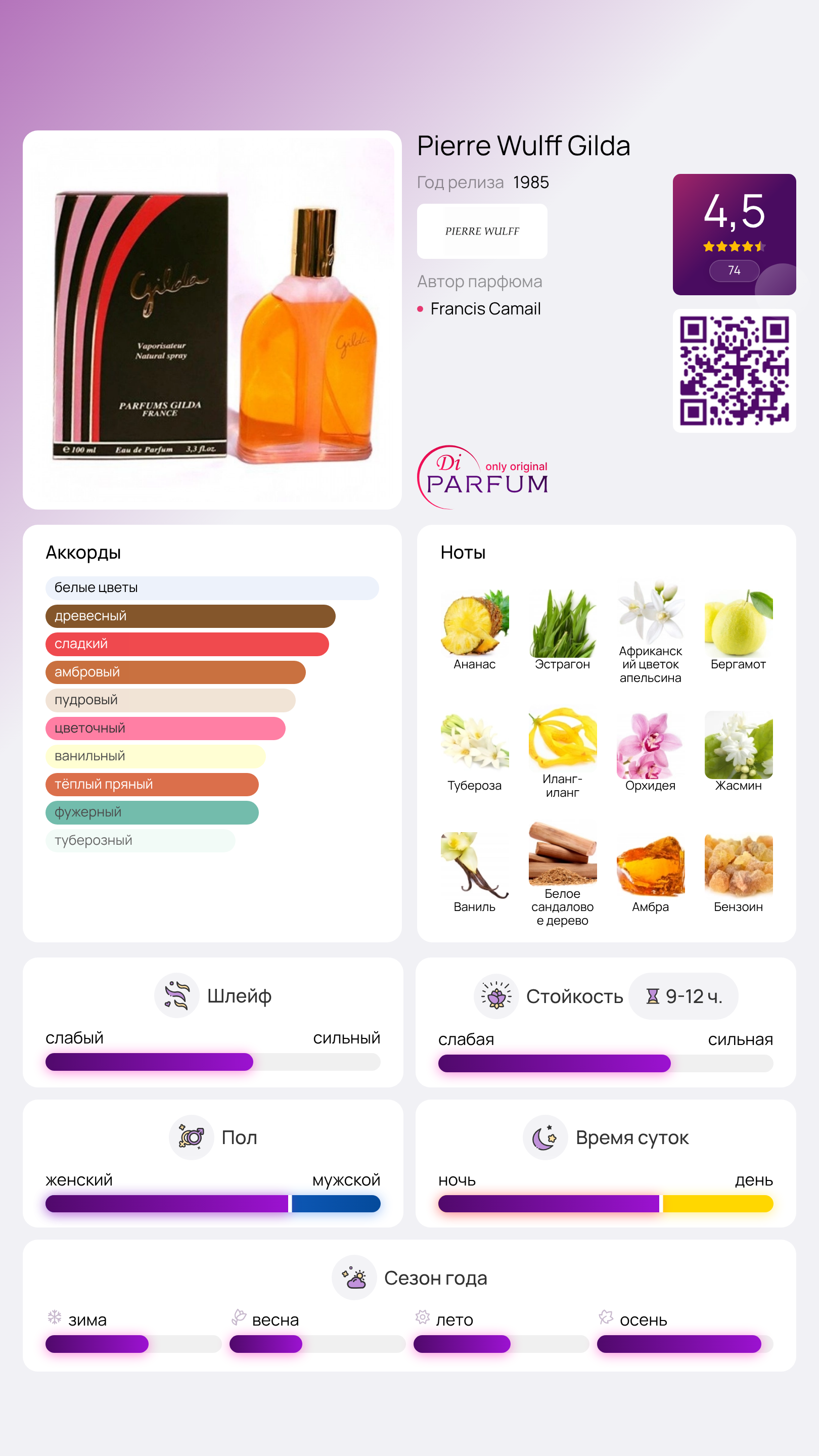 В 1985 году во Франции появился одноименный аромат Pierre Wulff Gilda, посвященный образу утонченной, смелой и завораживающей женщины, какой была Рита Хейворт. Эта парфюмерная композиция отличается невероятной красотой и глубиной. Несмотря на то, что сегодня ее относят к винтажным ароматам, она остается популярной среди женщин по всему миру.
