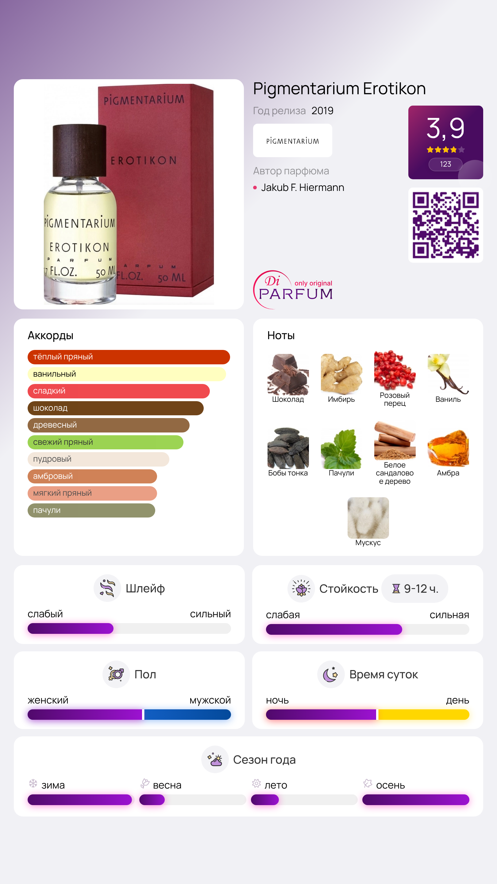 Erotikon принадлежит к семействам пряных и древесных ароматов, которые создают теплую и обволакивающую атмосферу. В верхних нотах вы почувствуете сладость шоколада, остроту имбиря и яркость розового перца, что создает интригующее начало. Сердце аромата раскрывается нежными акцентами ванили и бобов тонка, придавая композиции мягкость и утонченность.