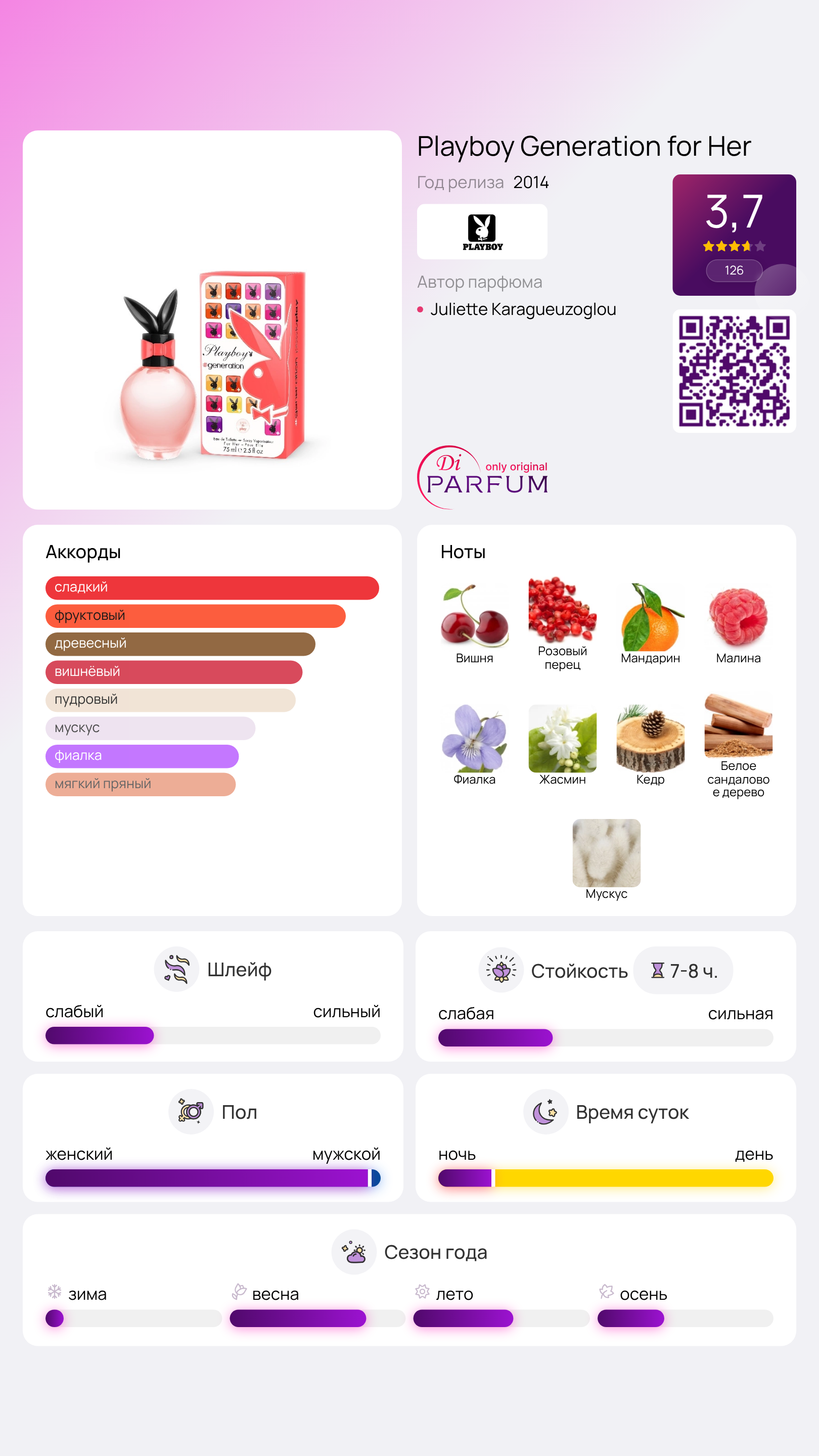 Аромат Generation for Her от Playboy ориентирован на молодежную аудиторию, предполагая, что он идеально подойдет для тех, кто наслаждается яркими вечеринками, фотосессиями и активным присутствием в социальных сетях, где можно продемонстрировать свою насыщенную жизнь.