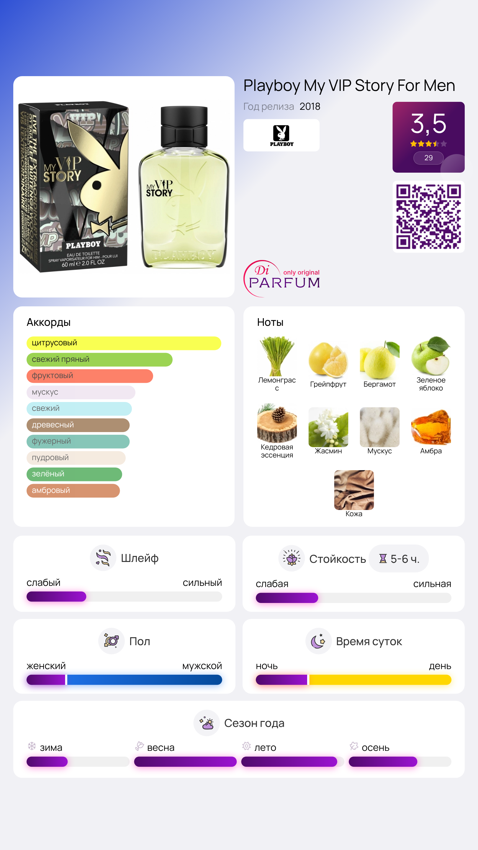 Ароматические духи Playboy My VIP Story For Men, выпущенные в 2018 году, являются мужской частью уникального дуэта. Они воплощают образ истинного Плейбоя, для которого роскошь не является главным приоритетом. Такой человек ценит в жизни ум, очарование и способность находить выход из трудных ситуаций, а также обладает впечатляющим вкусом, позволяющим ему использовать свои сильные стороны по максимуму.