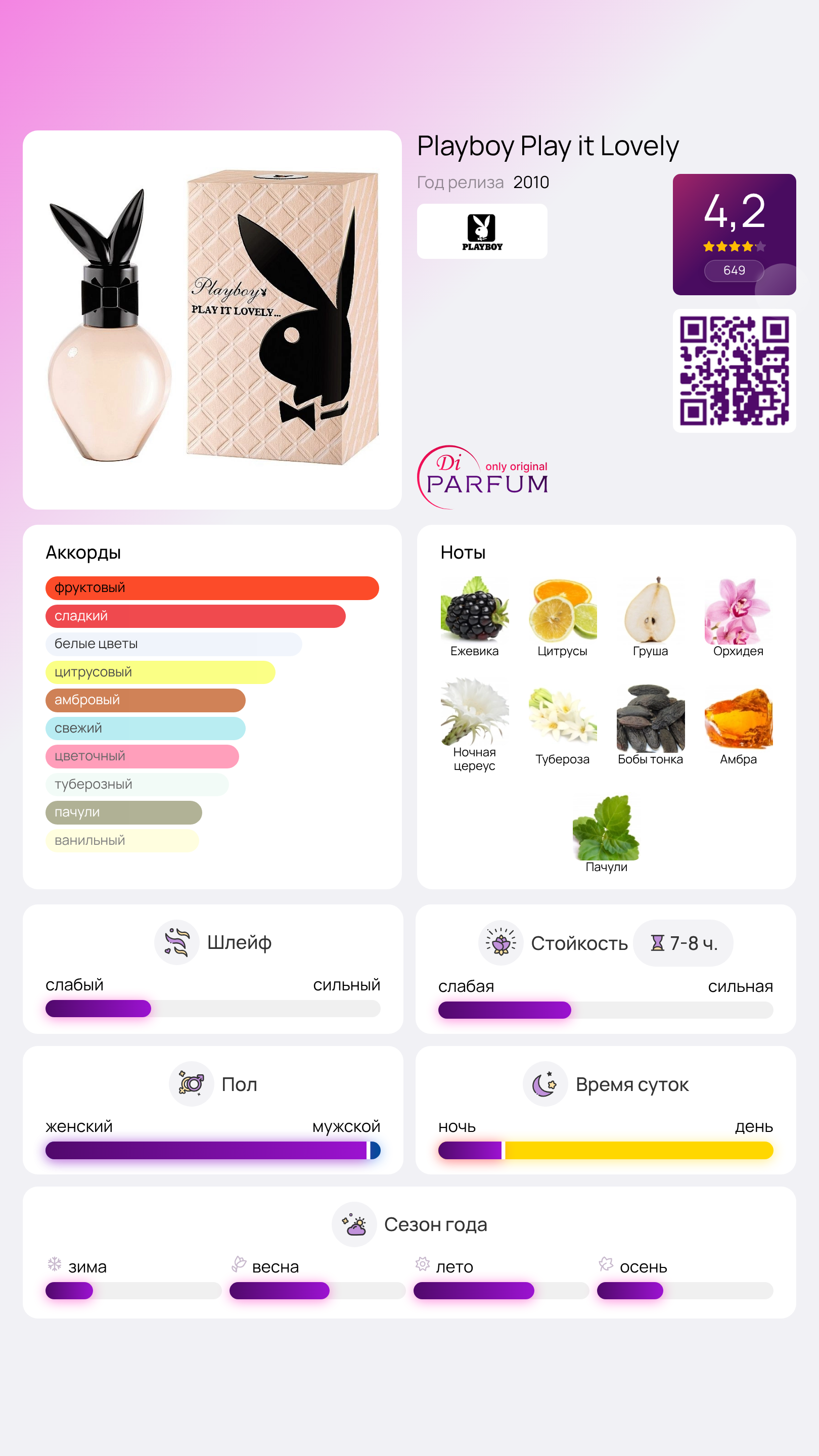 Фруктовые ароматы привлекают и манят, орхидея завораживает, а теплые ноты амбры и пачули намекают на возможность чего-то большего, чем просто игривый флирт. Начните ваше увлекательное приключение с Play It Lovely.
