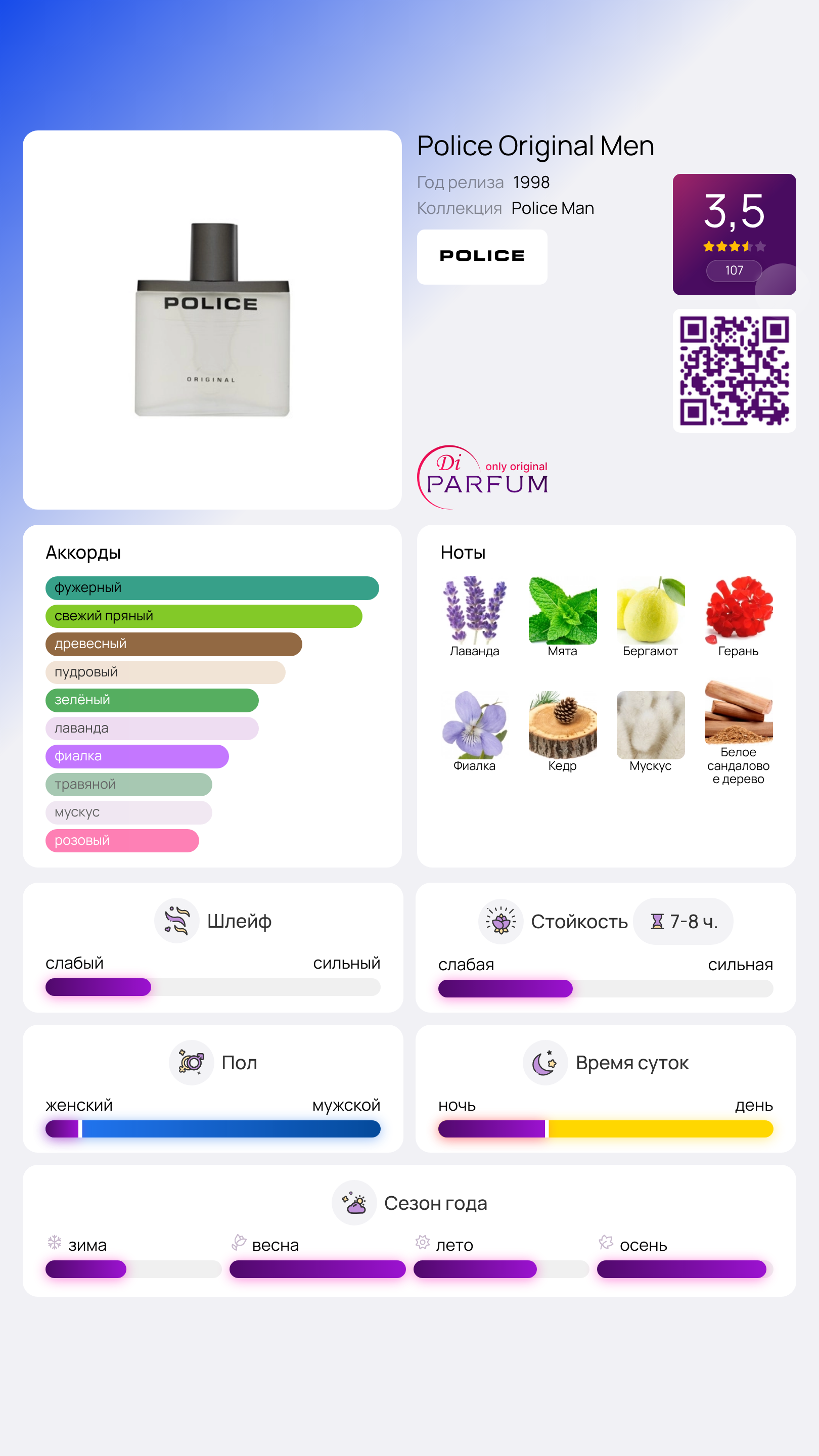 Parfum Police Original Men предназначен для уверенного, современного и элегантного мужчины, который стремится выделяться. Этот свежий и игривый аромат подчеркивает стильный и лаконичный образ истинного мужчины, осознающего свою ценность.