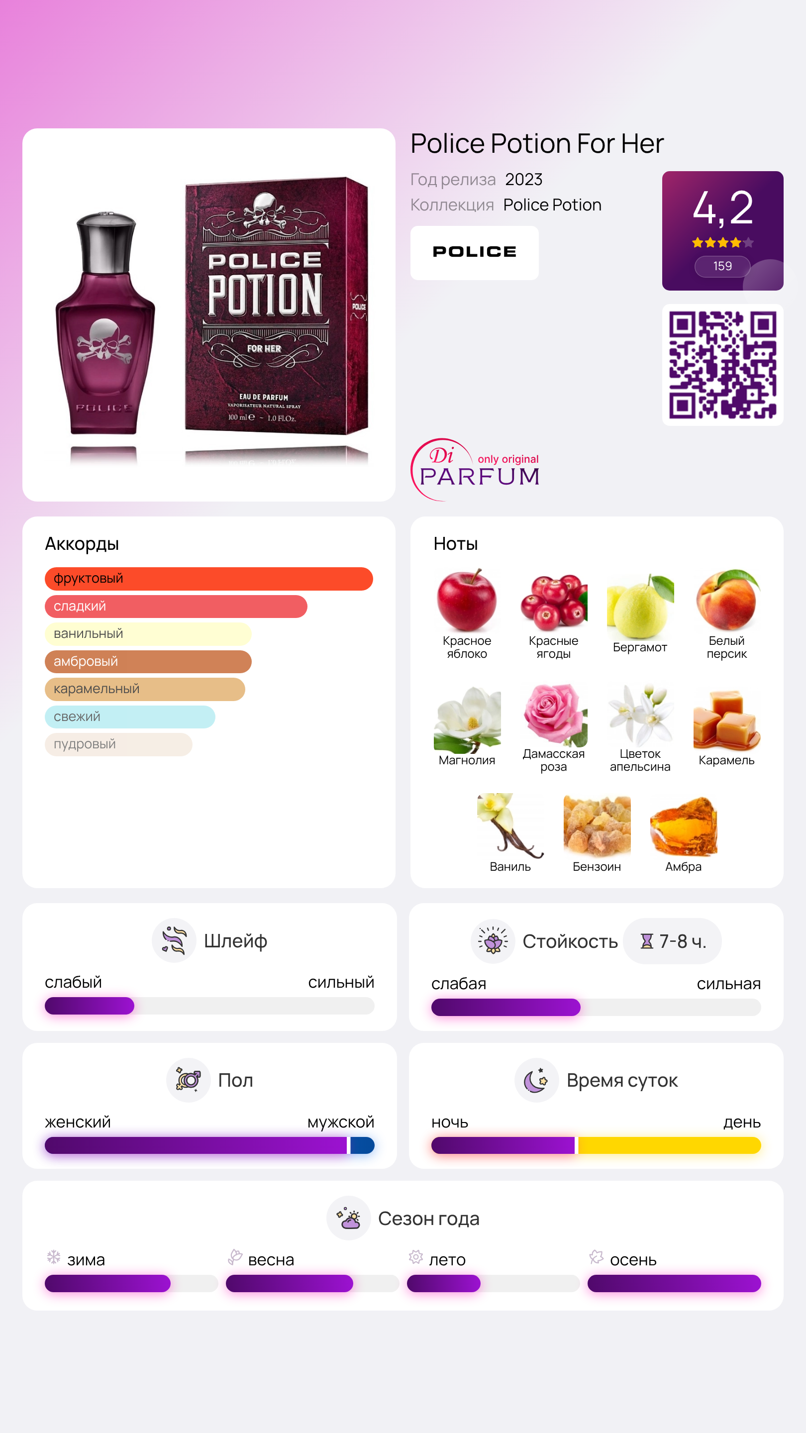 Police Potion For Her от Police — это цветочно-фруктовый аромат для женщин, который был представлен в 2023 году. Он идеально подходит для ярких и уверенных в себе женщин, которые любят привлекать внимание.