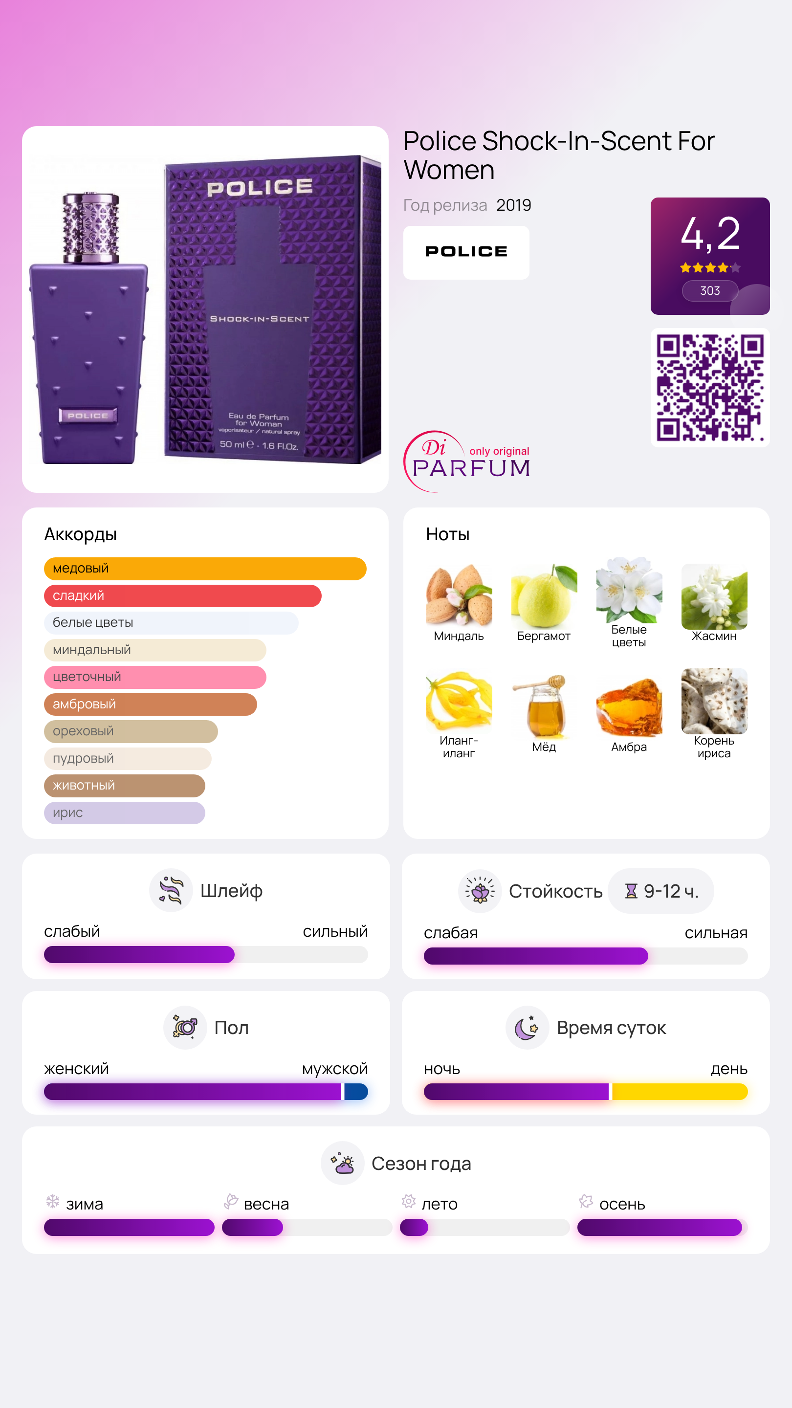 Переход от «романтичной незнакомки» к «роковой диве» происходит постепенно, оставляя запоминающееся послевкусие. Заключительная нота – триумф контрастов: амбра приносит животную теплоту, ирис добавляет пудровый намек загадочности, а мёд завершает композицию своей сладостью, почти греховной. Police Shock-In-Scent For Women – аромат для тех, кто не любит стандарты. Дизайн с шипами символизирует то, что внутри скрывается нечто большее, чем традиционные цветочные парфюмы.