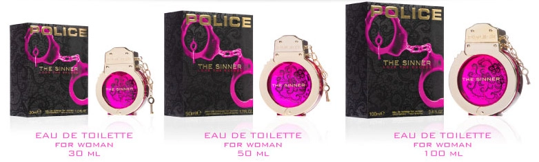 The Sinner for Women от Police был представлен брендом из Италии в 2014 году в формате туалетной воды. Этот аромат олицетворяет женщину с яркой энергетикой. Дизайн флакона поражает своей смелостью и ассоциируется с золотыми наручниками. Интересным элементом является фосфоресцирующее покрытие упаковки. Нежно-розовый флакон, украшенный кокетливым черным кружевом, дополняется маленьким ключиком. Все это намекает на страсть и эротические игры.