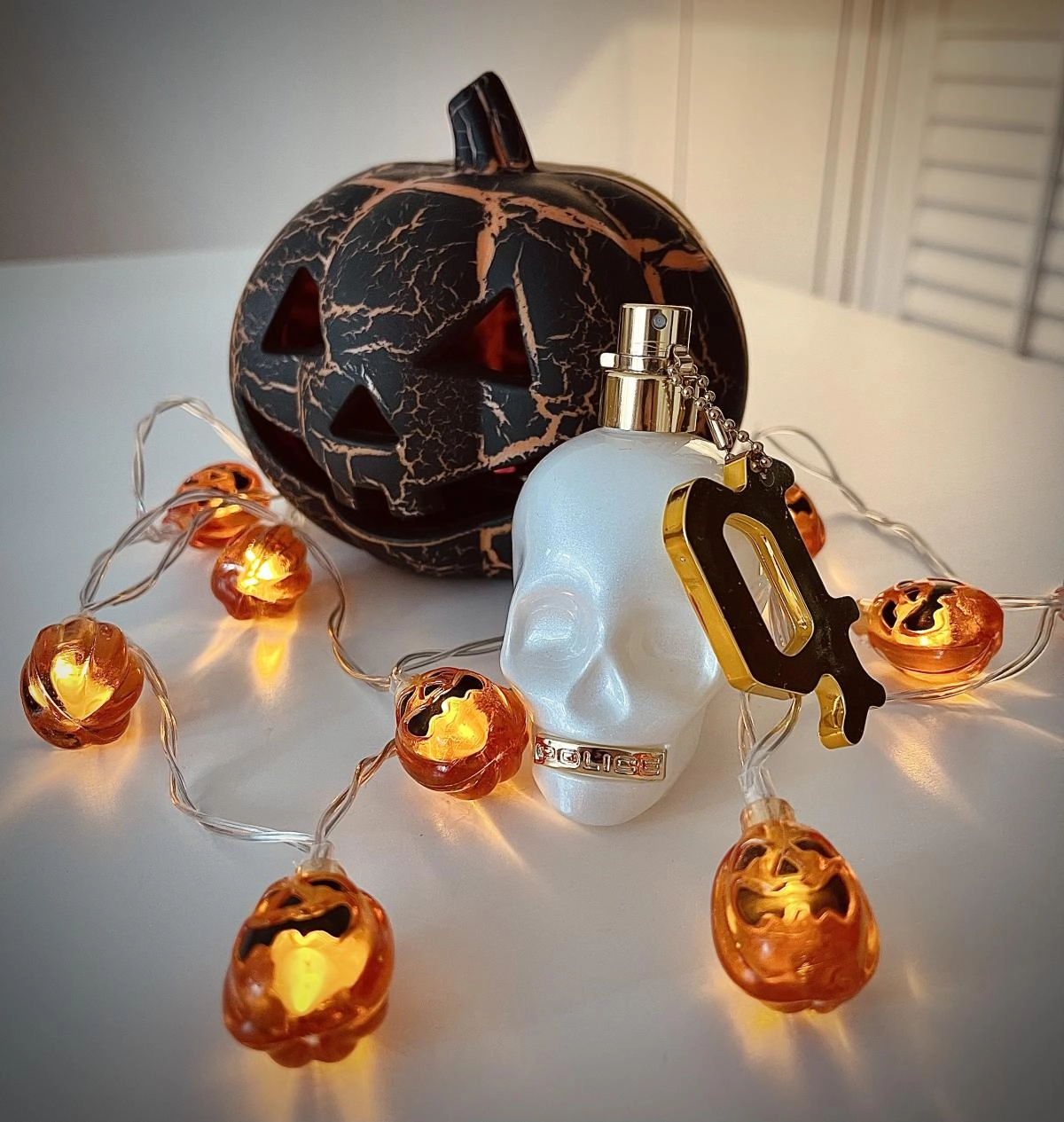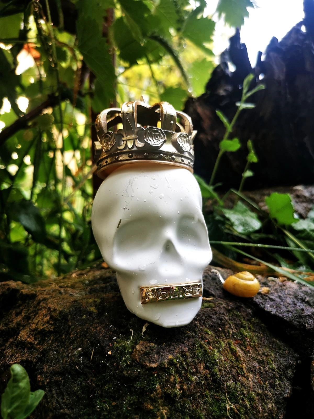 Далее аккорды переплетаются с насыщенной шоколадной крепостью кофе, окруженной благородным жасмином, величественной розой и кисло-сладкой сливой. На завершение раскрываются сладость ванили, очарование пачули и загадочные переливы сандала. Аромат представлен в фирменном флаконе, который выглядит как белый череп, украшенный золотыми деталями.