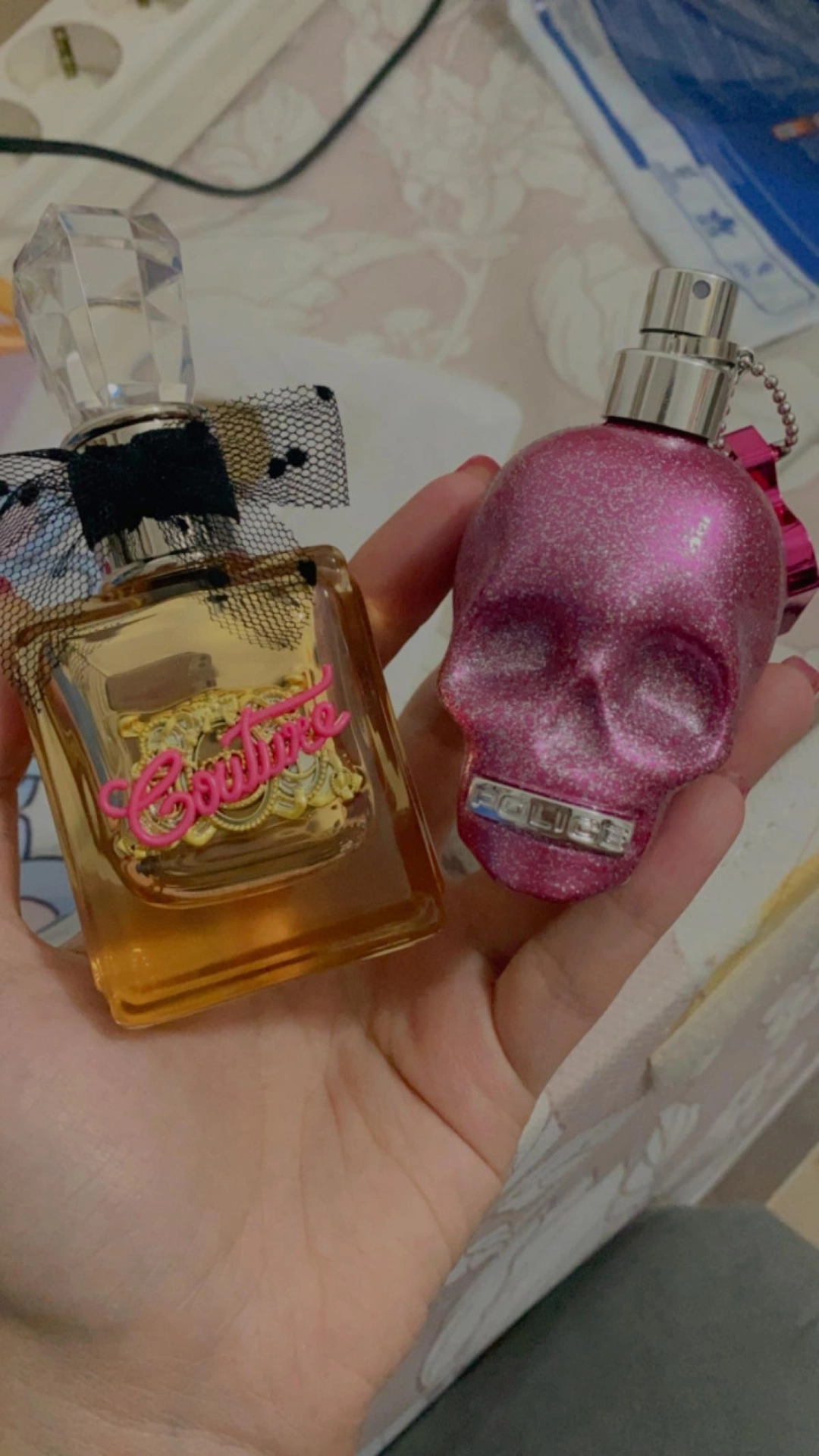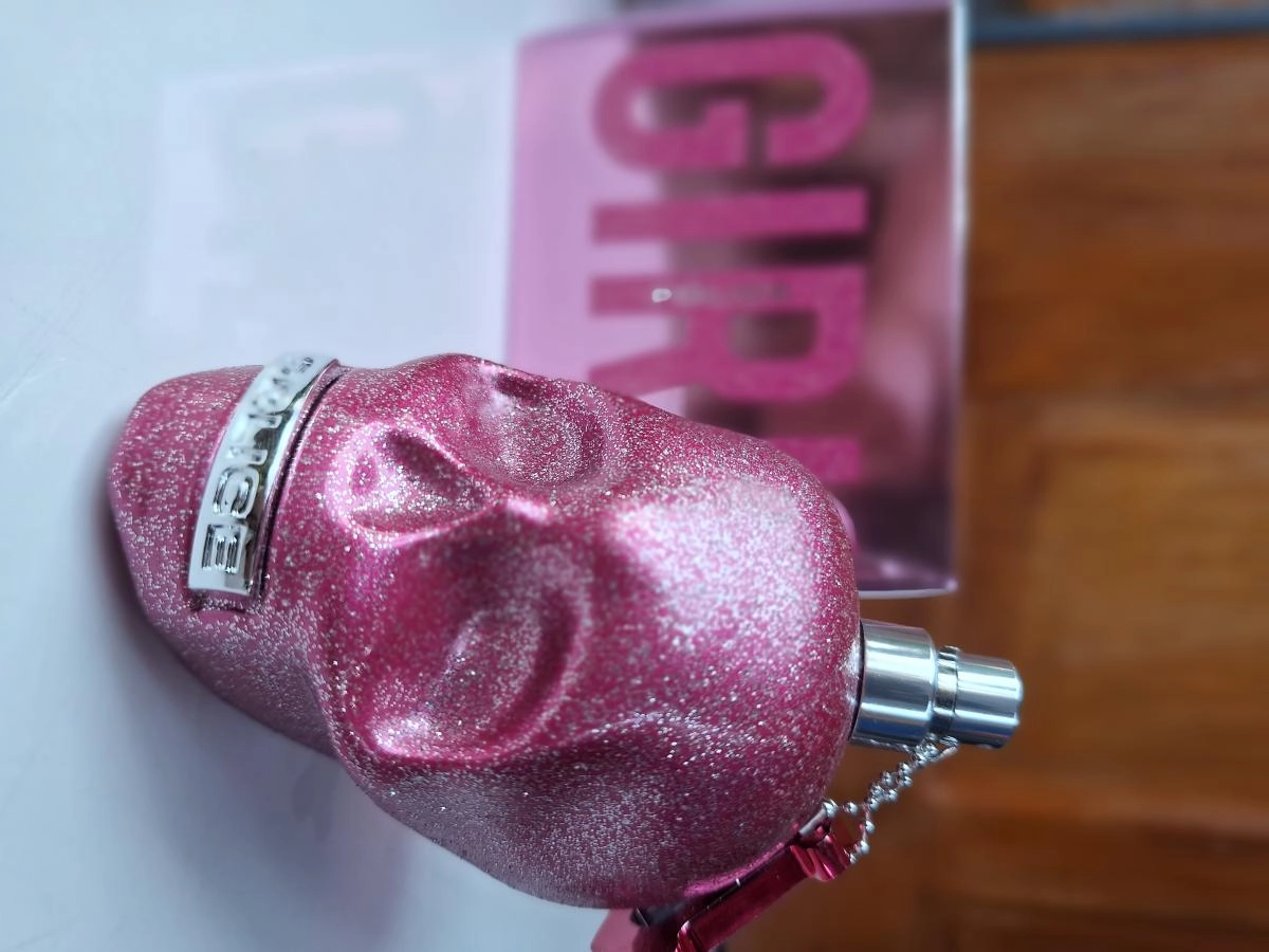 Флакон в форме черепа, окрашенный в розовый цвет, стал символом гламура и моды. Он дополнен стильными блестками и подвеской с логотипом, создавая уникальный аксессуар для истинных любителей парфюмерии.