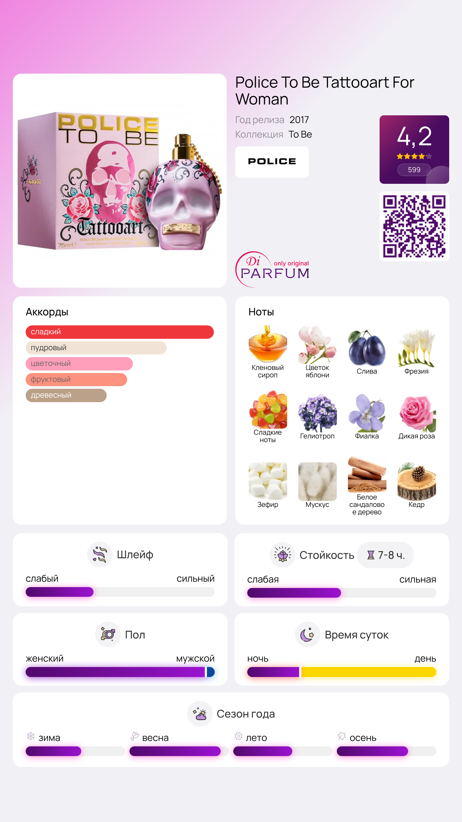 Представьте себе утренние часы в великолепном саду, где цветы источают свои ароматы, а спелые фрукты завораживают своим благоуханием. Сделайте глубокий вдох, и вы окажетесь под влиянием новой парфюмерной воды Police To Be Tattooart For Woman – изящной композиции, созданной мастерами итальянской парфюмерии Police. Этот аромат, выпущенный в 2017 году, воплощает дерзость современности и нежность женской души.