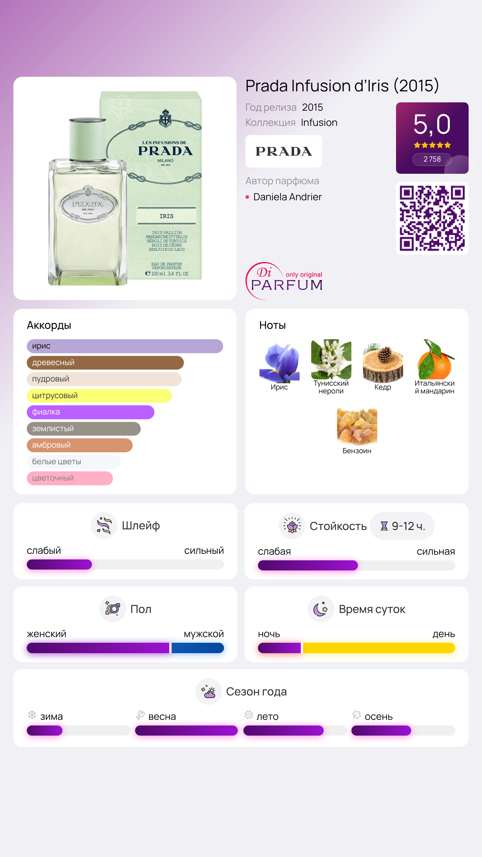 Prada представляет новый женский парфюм Infusion d`Iris, разработанный парфюмером Даниэлой Андриер, который стал вторым ароматом в новой коллекции бренда. Этот парфюм удивляет свежим подходом к аромату ириса и ароматической композиции, в которую введены элементы, традиционно ассоциирующиеся с мужскими духами.