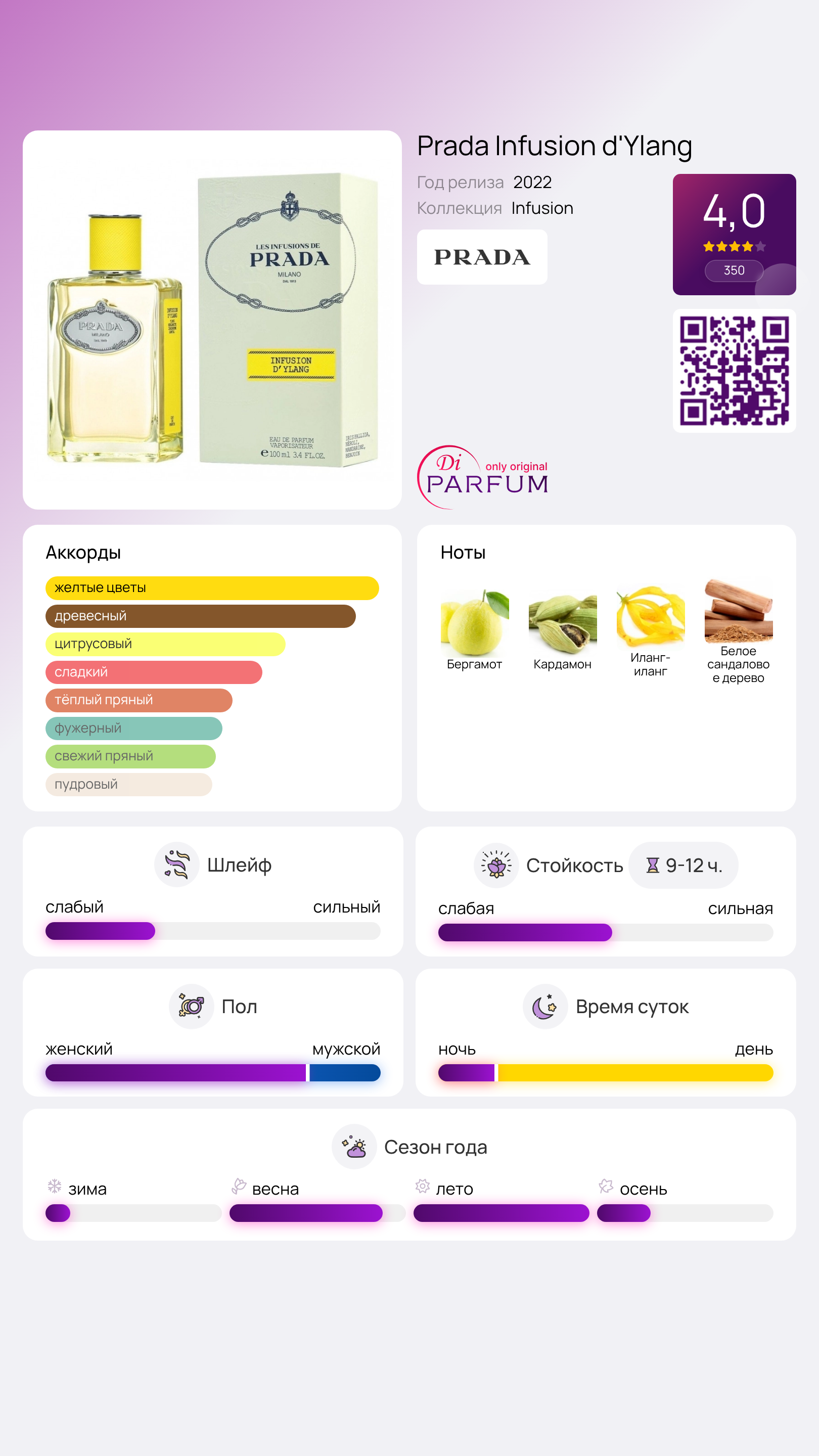 Привлекательная цветочная композиция Prada Infusion d'Ylang представляет собой волшебный экстракт иланга, который подчеркивает яркую индивидуальность этого природного афродизиака. Тропический аккорд иланга описывается как «древняя натуральность, восстановленная с помощью современных технологий». Парфюмер продемонстрировал выдающееся художественное мастерство.