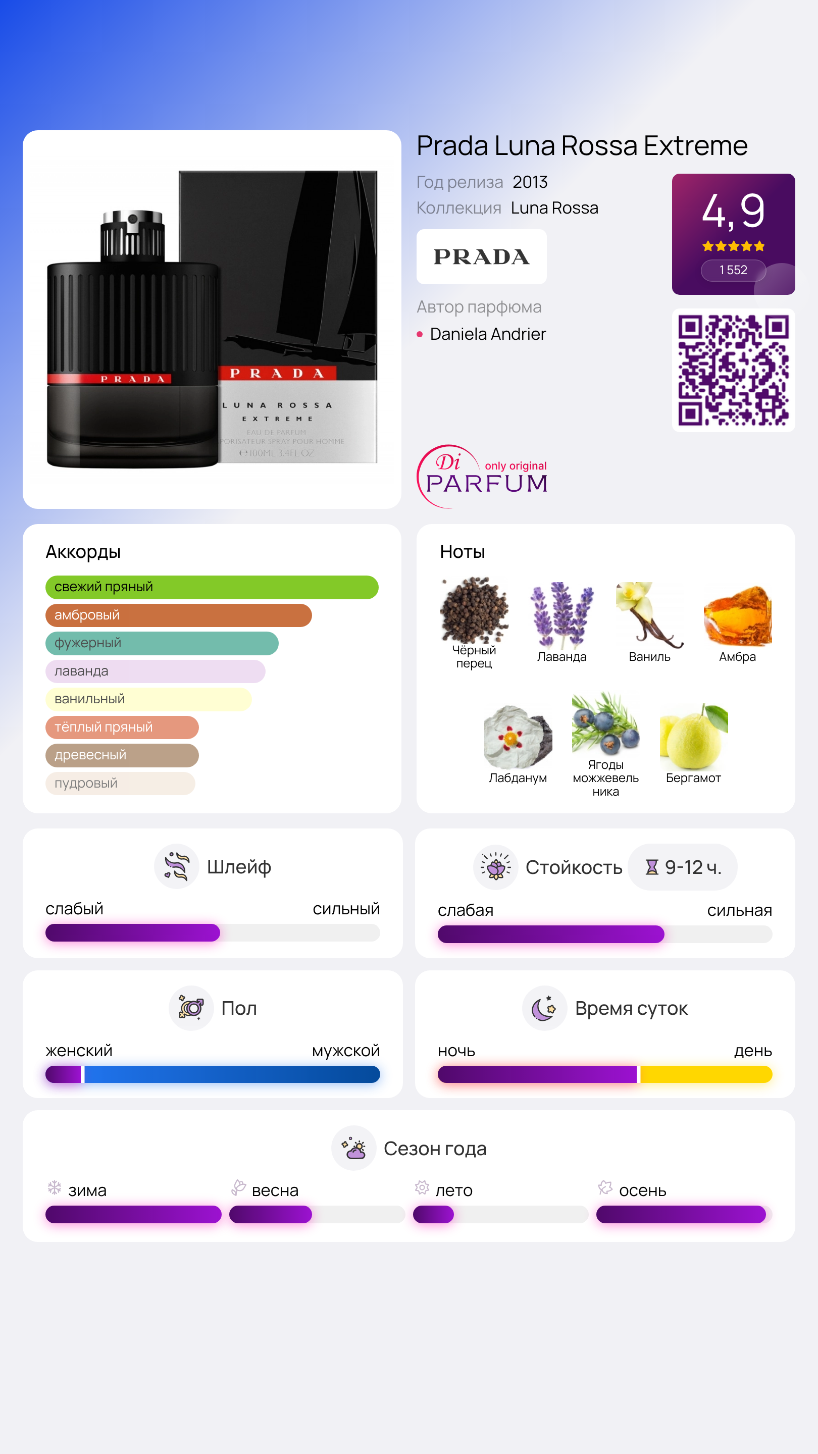 Luna Rossa Extreme, представитель знаменитого бренда Prada, разрывает рамки обычного, побуждая к риску и наслаждению жизнью по-настоящему. Этот аромат, словно острое лезвие, выглядит как гармония свежести бергамота и остроты черного перца. Его характер формируется за счет густого лабданума, яркого можжевельника и мягкой лаванды.