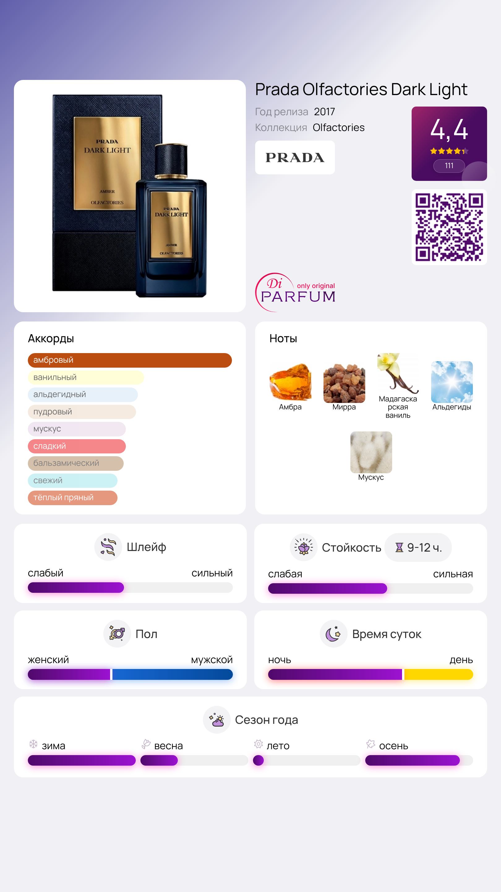 Элегантный восточно-амбровый аромат Prada Olfactories Dark Light стал частью коллекции Mirages, выпущенной в 2017 году. Эта линейка является продолжением популярных ароматов, представленных культовым французским брендом Olfactories в 2015 году. Вдохновение для создания этого парфюма почерпнуто из восточной культуры. Он сравним с неуловимым солнечным лучом, который проникает сквозь темноту ночи, подобно свету, застывшему в ожидании бурного события. По словам пресс-службы, запах «Темного Света» включает в себя давние контрасты, которые существуют дольше самого времени памяти.