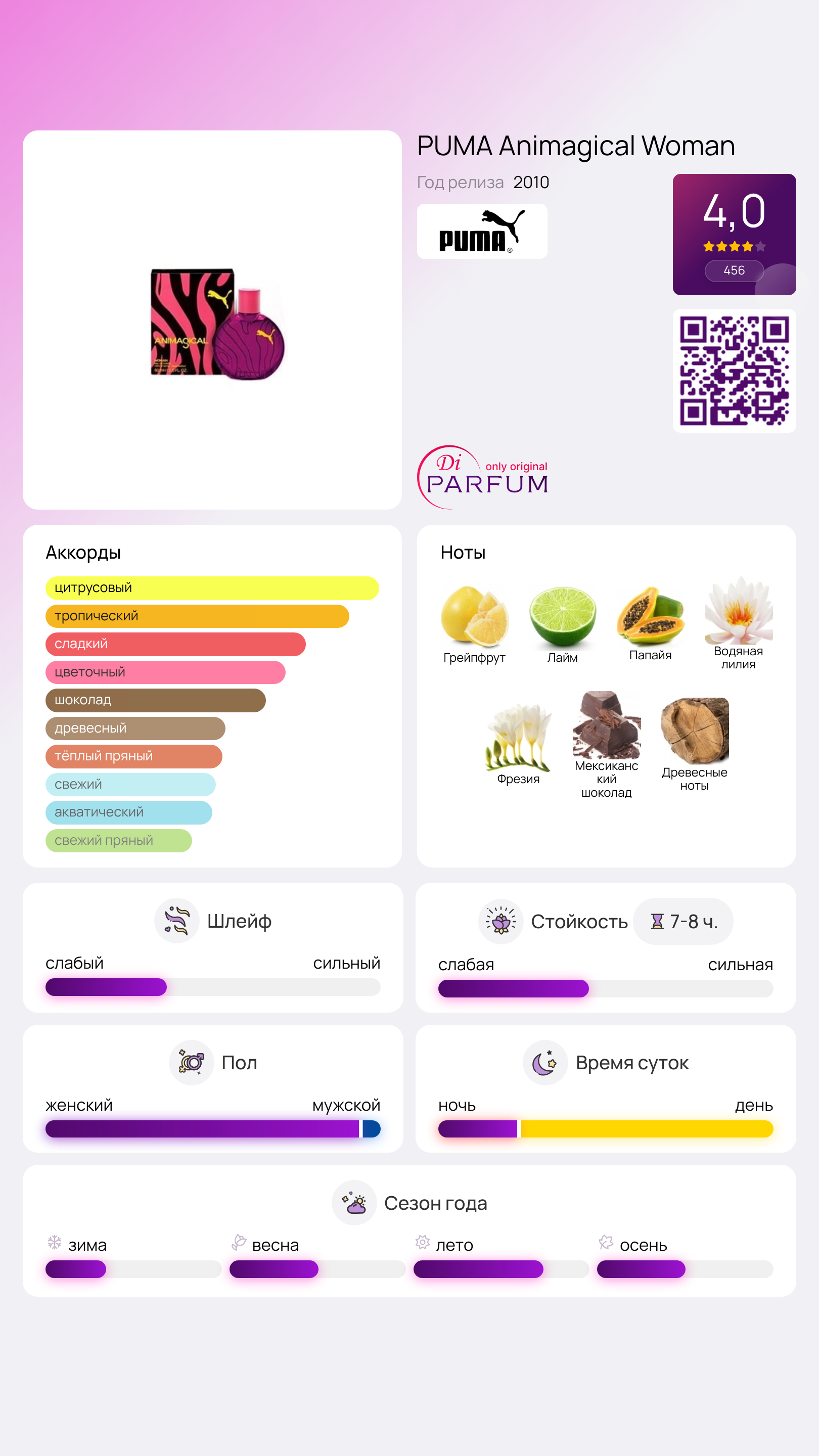 Puma Animagical Woman представляет собой цветочно-фруктово-древесный парфюм, который способен моментально улучшить настроение и принести удовольствие в холодный осенний день.