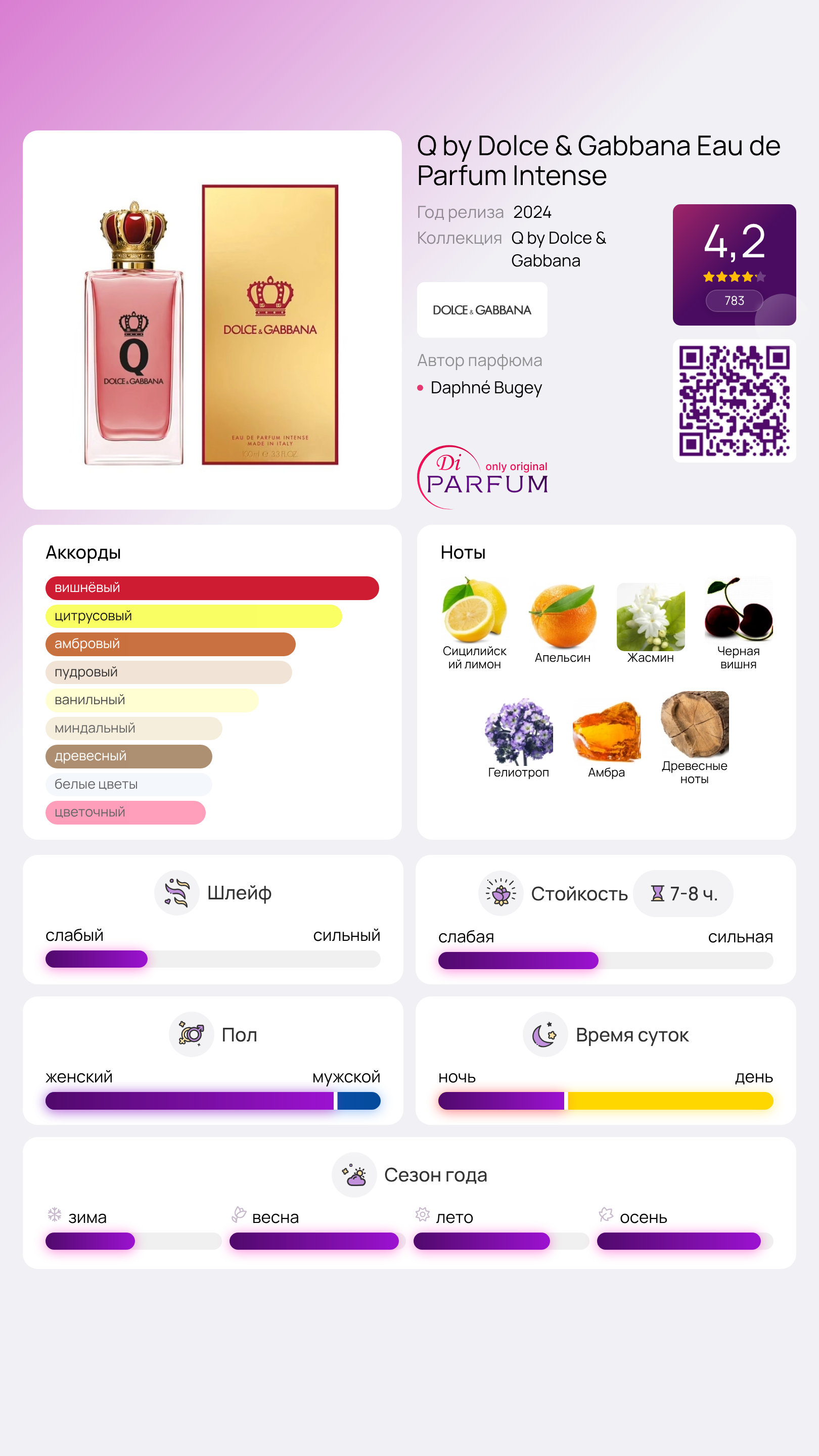 Королева имеет возможность заменить Короля, но ее верность фавориту остается неизменной - это элегантная новинка 2024 года от DOLCE & GABBANA, парфюм Q by Dolce & Gabbana Eau de Parfum Intense. Дизайнеры Натали Лорсон и Дафна Бюже продолжают тренд на парные ароматы, выпуская этот фланкер одновременно с мужской версией. Флакон остался прежним, ведь трудно придумать более подходящий дизайн, чем великолепная ажурная корона на тяжелом стеклянном пузырьке.