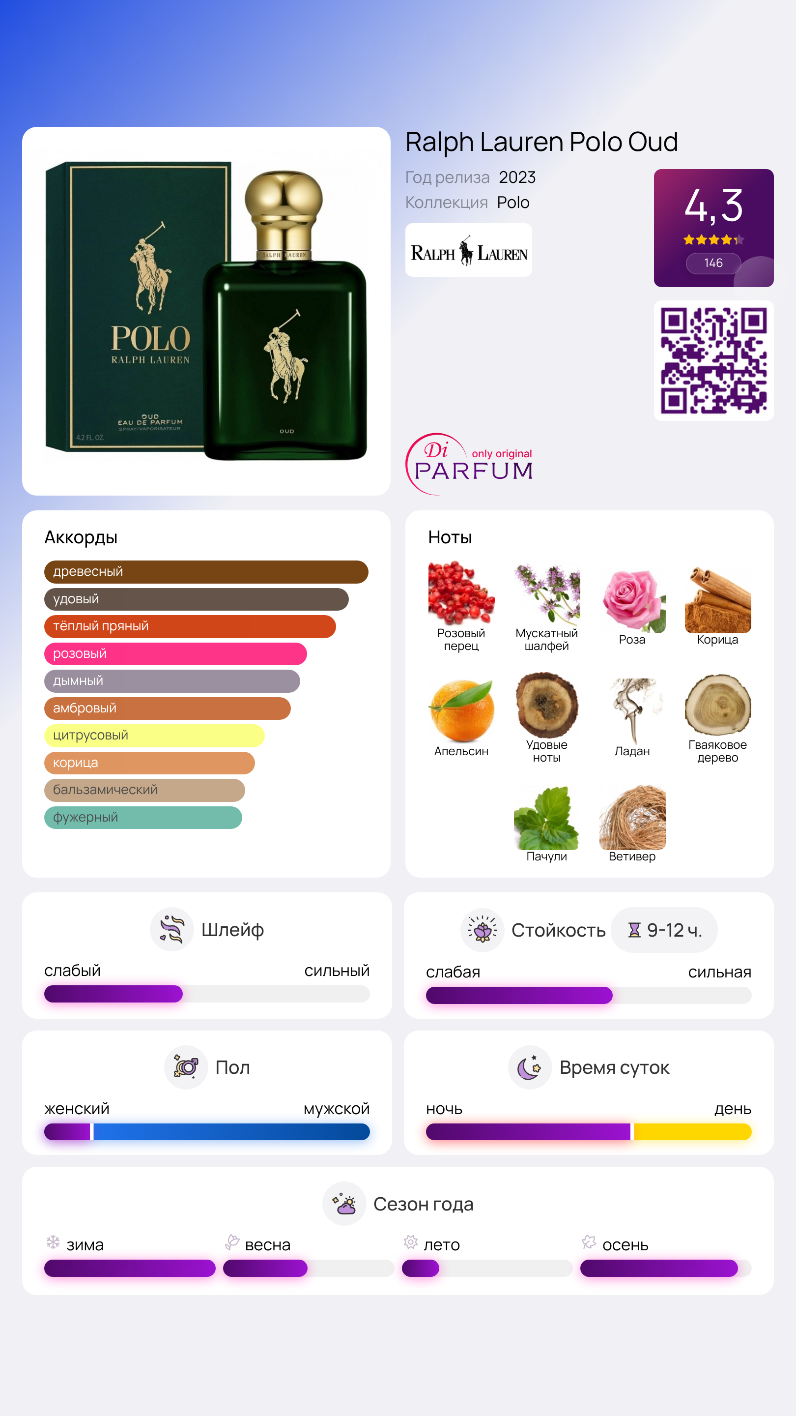 Polo Oud – это идеальный выбор для современных мужчин, которые ценят элегантность и силу. Этот аромат прекрасно подойдет для вечерних мероприятий и особых случаев, когда хочется выделиться и создать незабываемое впечатление.