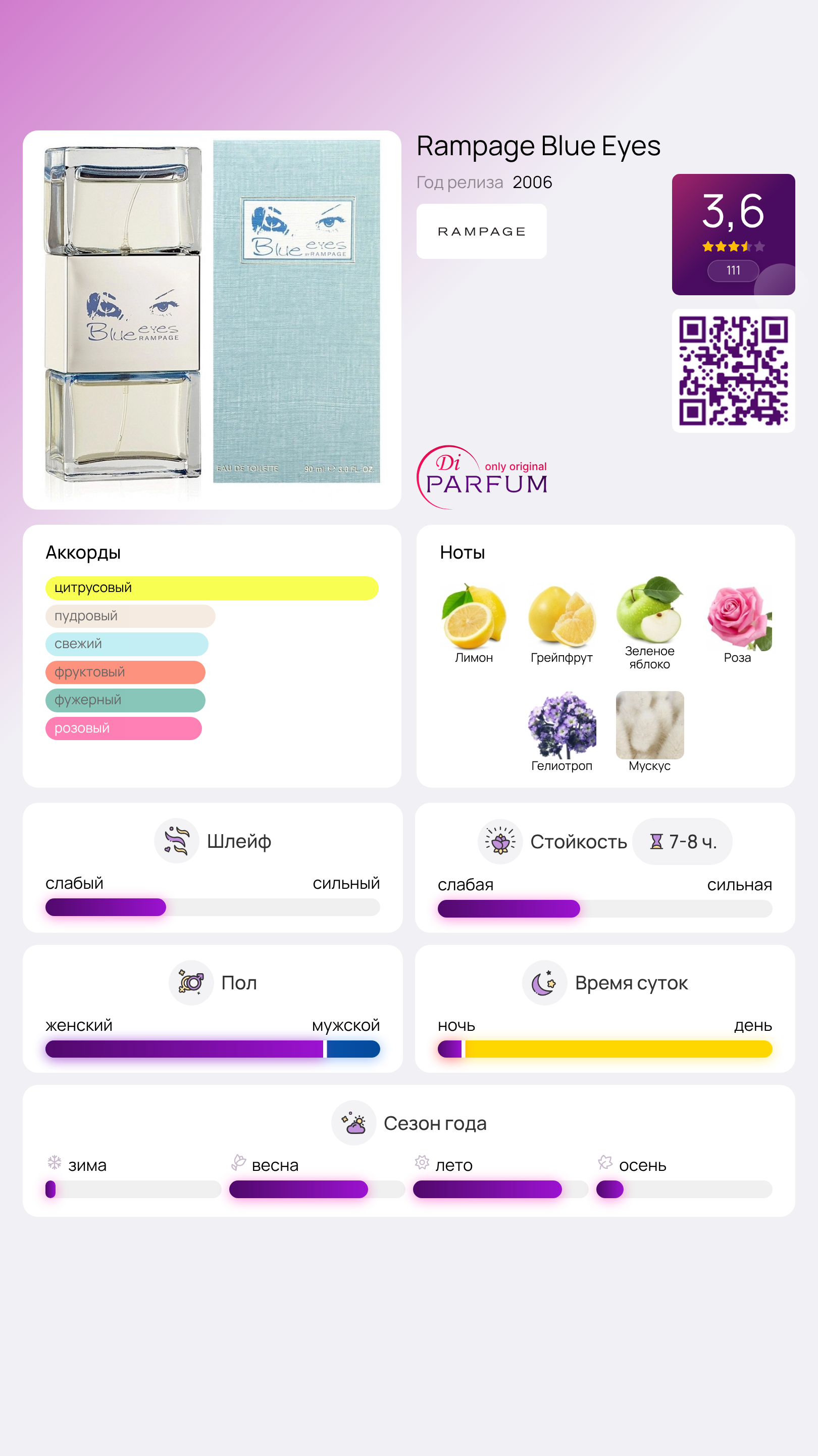 Дизайнерский дом Rampage создал аромат Blue Eyes в 2006 году, который получил посвящение всем голубоглазым красавицам, способным покорить сердца мужчин. Этот парфюм воплощает в себе истинную женственность и загадочность, характерные для каждой женщины.