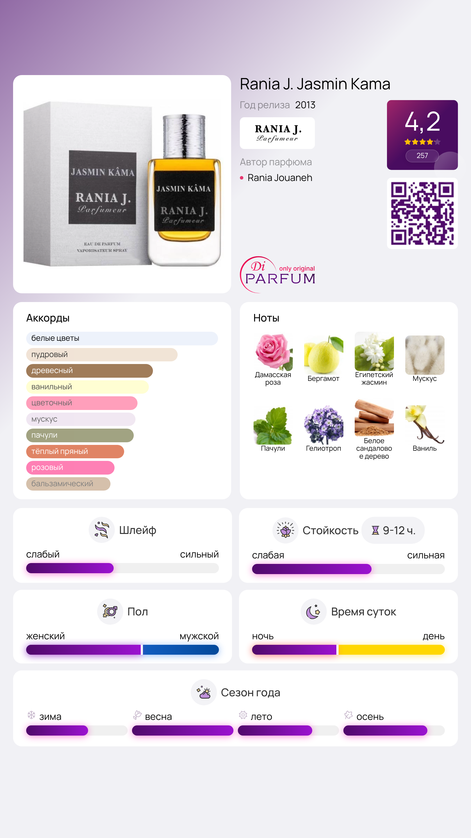 Изысканная цветочно-шипровая композиция основана на многослойной ноте душистого жасмина – цветка, который был одним из пяти, украшавших стрелы Камы, вызывая в людях страсть. Жасминовый абсолют был выбран парфюмером в качестве главной ноты, окруженной другими цветами, древесными акцентами и теплыми специями.