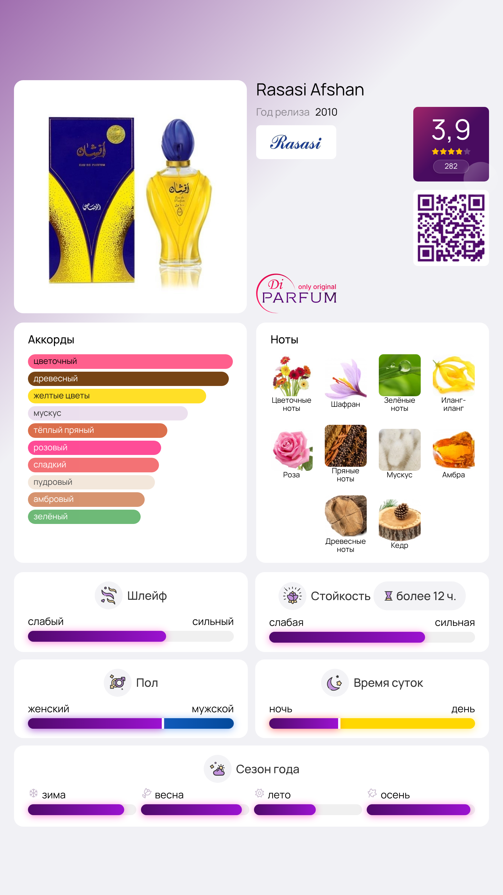 Особенное внимание в их ассортименте привлекает Afshan — аромат, который принадлежит к восточной категории и отличается великолепной стойкостью и шлейфом. Его начальные ноты впечатываются в сознание с мощной силой: шафран в сочетании с зелеными и цветочными оттенками наполняет воздух вокруг.