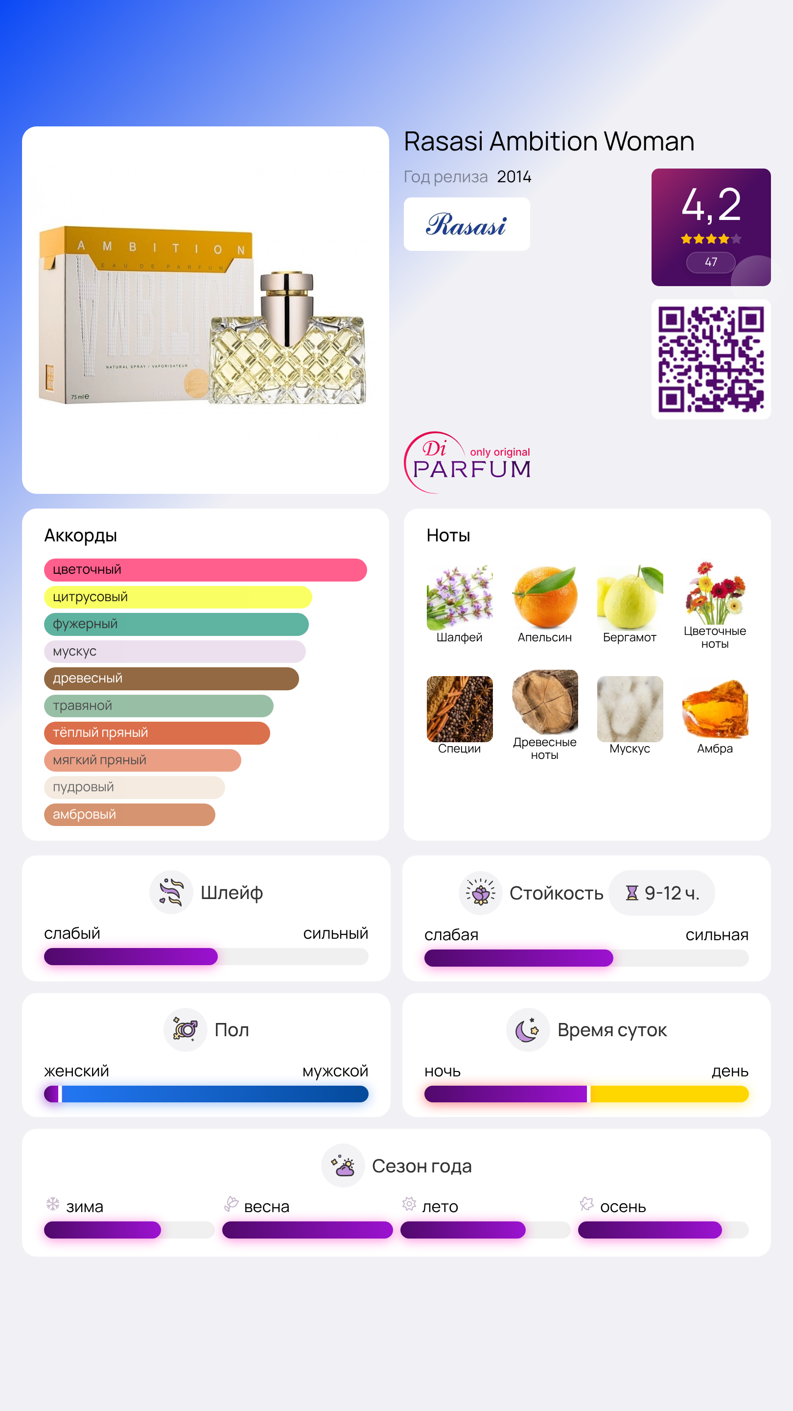 Парфюм для целеустремленных женщин Rasasi Ambition Woman представляет собой экзотичный, легкий и прекрасный букет, выполненный в восточном стиль, но адаптированный к вкусам европейской аудитории. Верхние и средние ноты Ambition Woman состоят исключительно из цветочных аккордов: композицию открывают фиалка и белая фрезия, за которыми следуют ирис, пион и роза в сердце аромата. Базовые ноты из амбры и ветивера не утежеляют парфюм, а наоборот, придают ему легкость, воздушность и изящество.