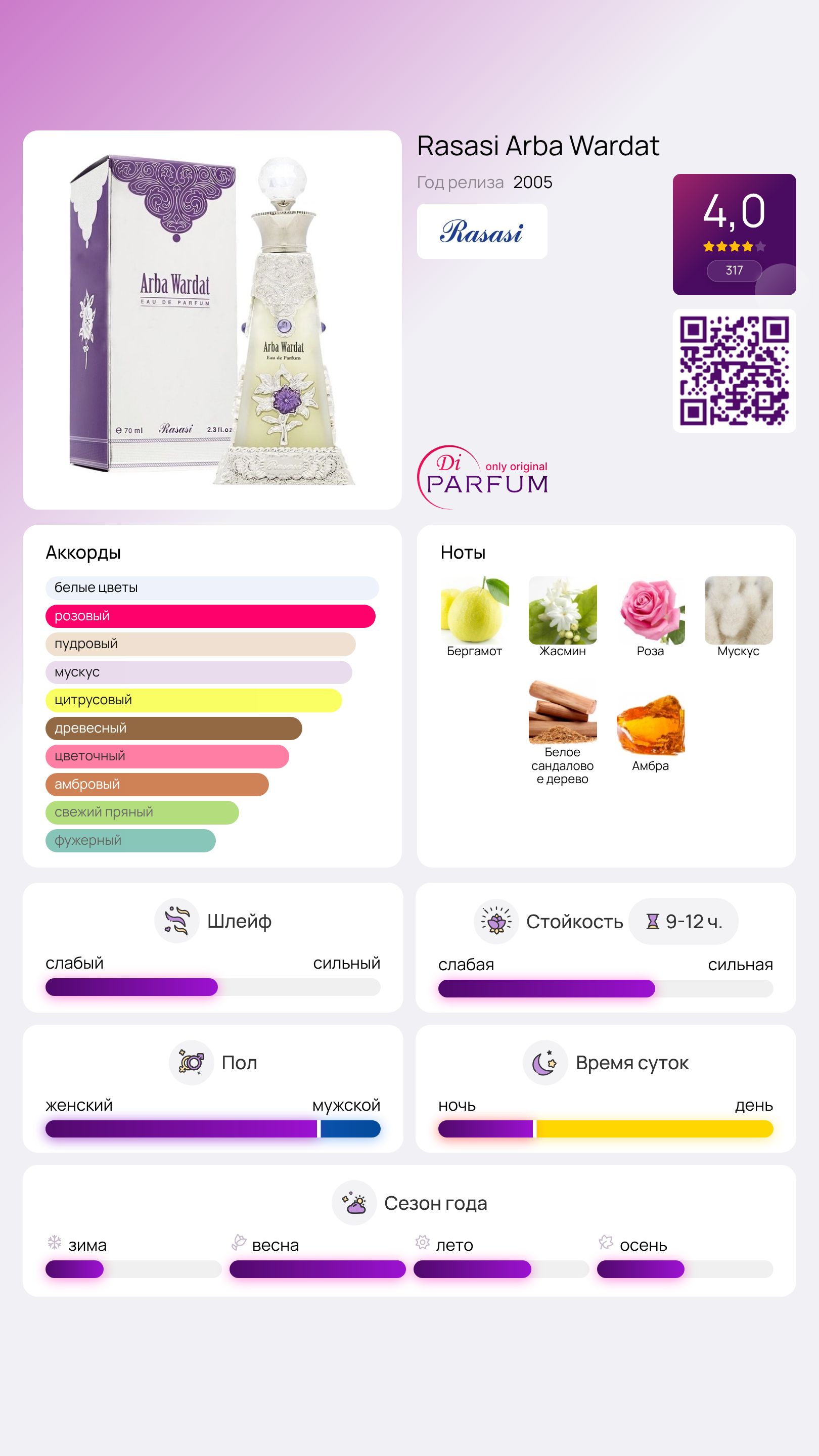 Когда мы рассматриваем парфюмерию как форму искусства, издание Arba Wardat от арабского бренда Rasasi может стать одним из самых ярких экспонатов в музейной коллекции. Как дизайн флакона, так и аромат в целом получают исключительно высокие оценки.
