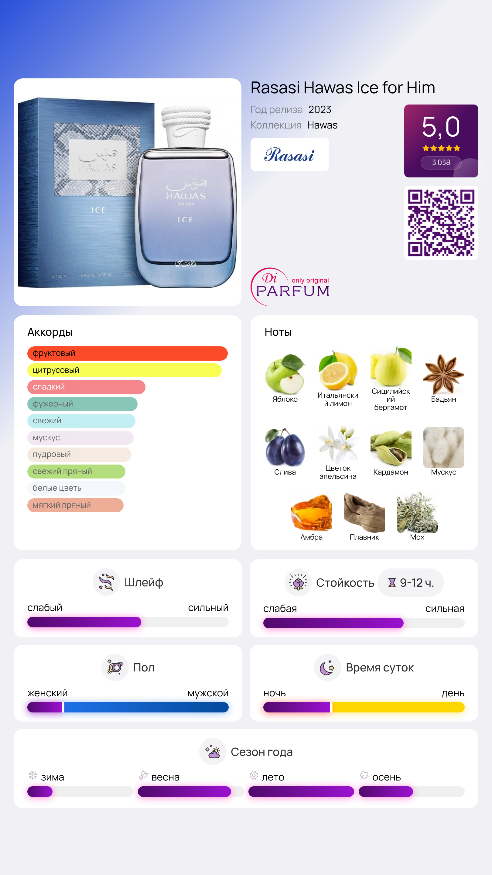 Новое дыхание классического аромата Rasasi 2015 года представлено в виде фланкера Hawas Ice for Him 2023, символизирующего уверенную мужскую чувственность. Линия Hawas славится своими яркими и насыщенными композициями, где восточная изысканность идеально сочетает современные тенденции. В этом новом продукте сохранена фирменная харизма оригинала, но добавлена льдистая свежесть, словно глоток ледяной воды в летний зной.