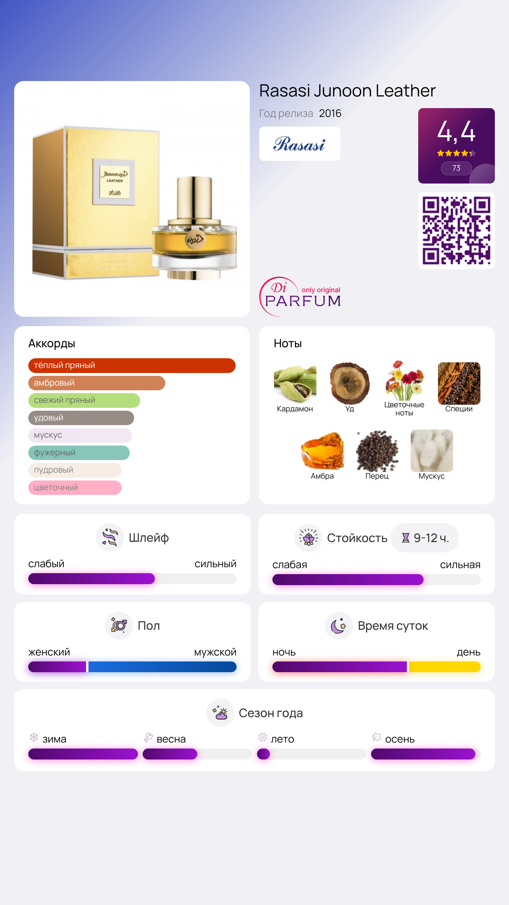 Коллекция Junoon — это триада нишевых ароматов, вдохновлённых стремлением человечества к роскоши и изысканности. Junoon-Leather, третья часть этой серии, особо подчеркивает материал, который на протяжении веков ассоциируется с силой и властью — кожу. Этот аромат подходит для тех, кто ищет не только утончённость, но и смелость в своём образе.