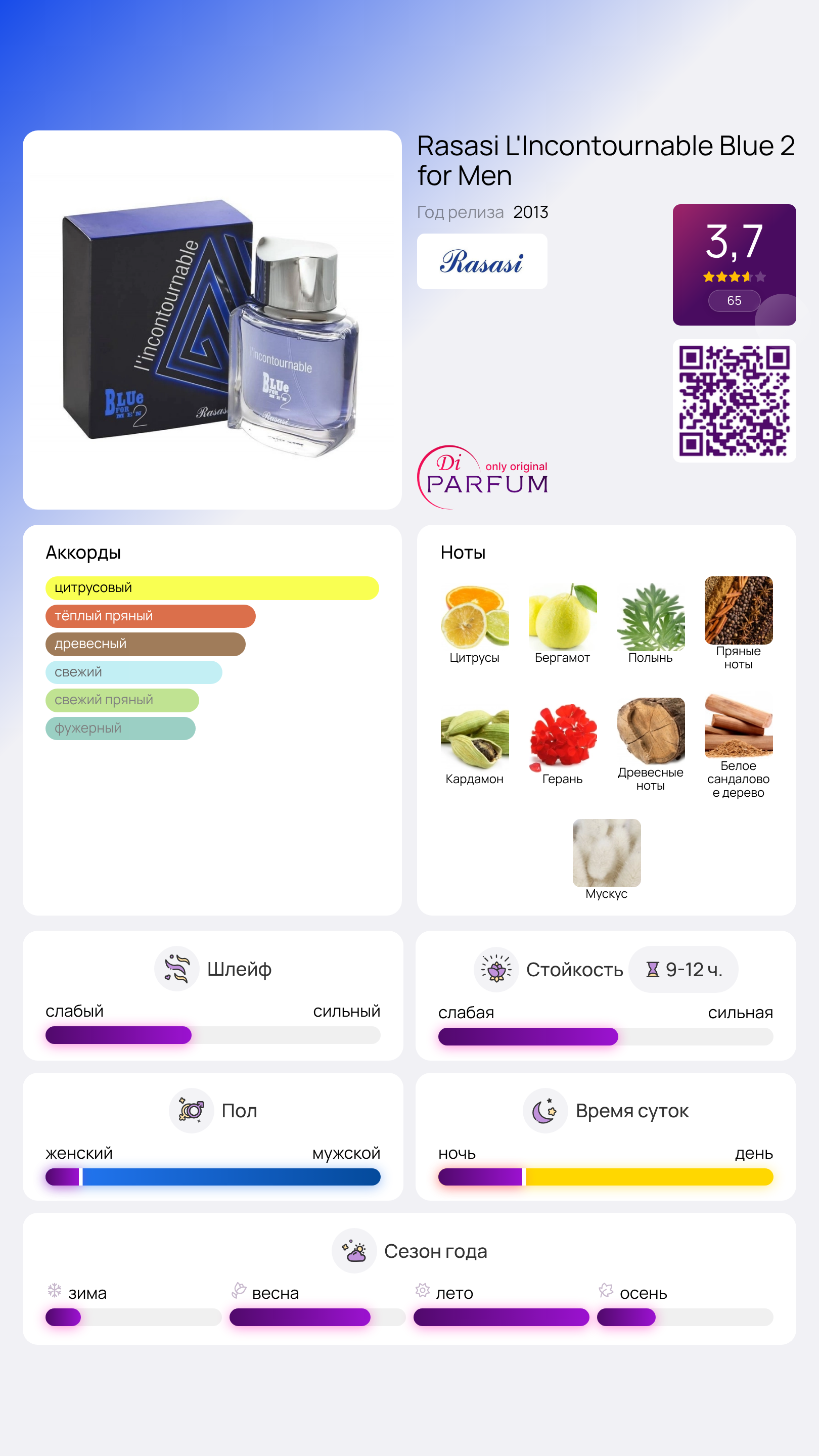 В базе композиции отчетливо слышны древесные ноты, сандал и мускус, создающие теплое и обволакивающее послевкусие. Этот аромат подходит для мужчин, которые ценят уникальность и хотят оставить за собой запоминающийся шлейф.