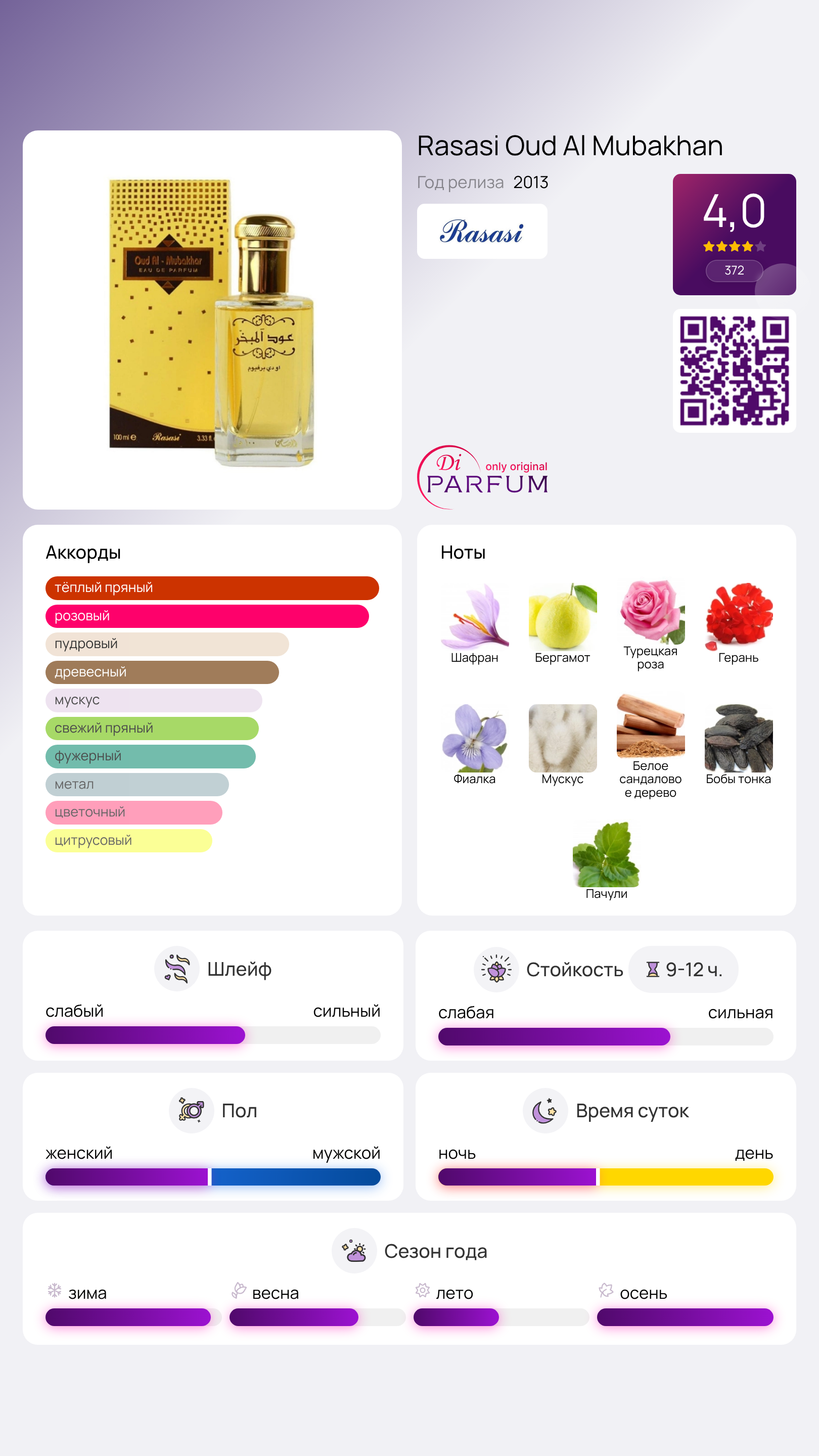 В верхних нотах раскрывается яркий и пряный аромат шафрана, который соединяется с освежающим бергамотом, создавая интригующее первое впечатление. Сердце аромата состоит из нежной турецкой розы, герани и фиалки, что придаёт ему цветочно-фруктовый оттенок, обладающий глубиной и утонченностью. Завершают композицию базовые ноты мускуса, сандалового дерева, бобов тонка и пачули, создавая теплый и стойкий шлейф, который будет долго радовать вас и окружающих.