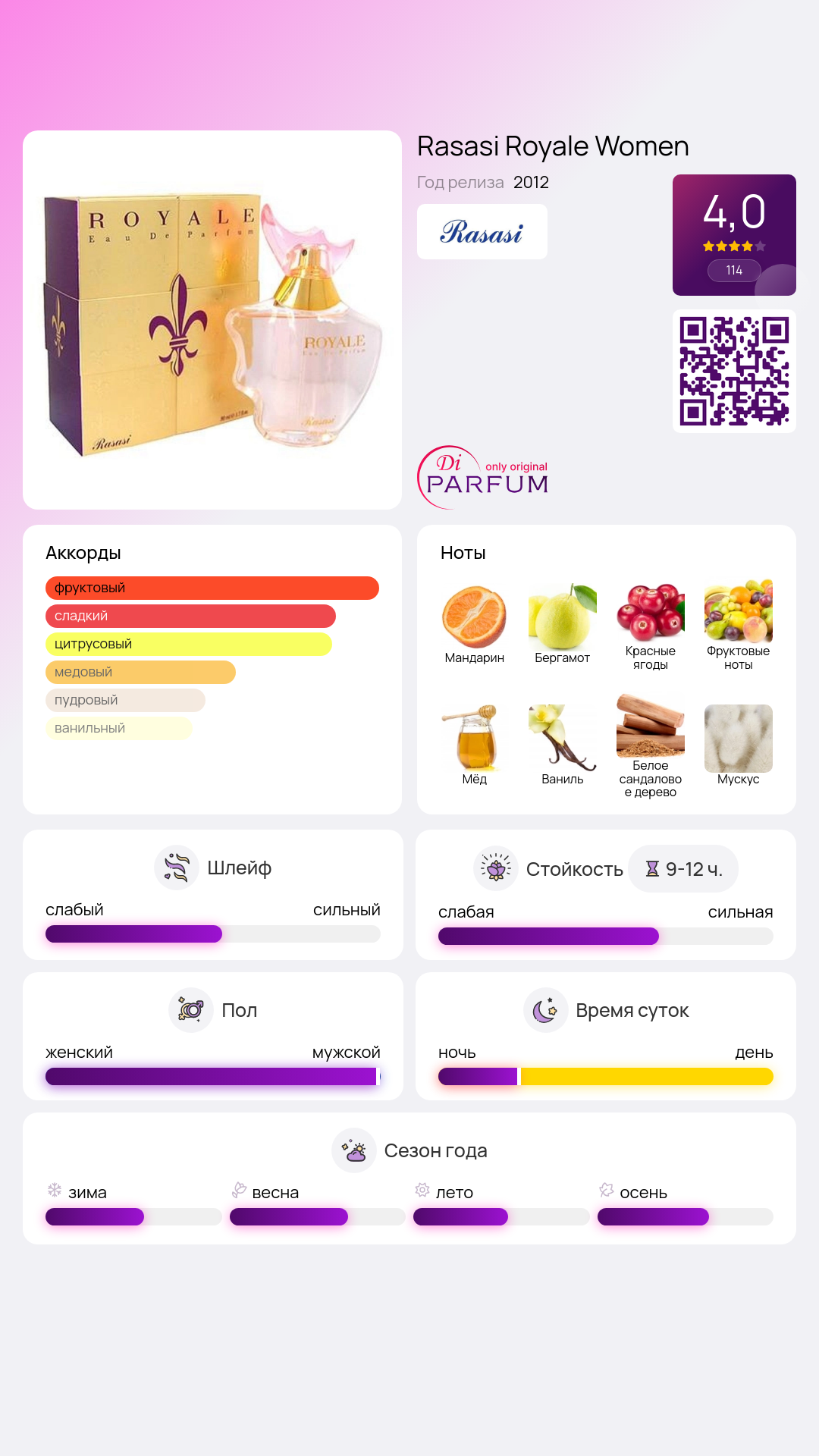 Завершающие ноты меда, ванили, мускуса и сандалового дерева нежно обволакивают, создавая ощущение тепла и уюта. Благодаря своему многослойному звучанию, этот аромат подходит как для повседневного использования, так и для особых случаев, подчеркивая индивидуальность каждой женщины.