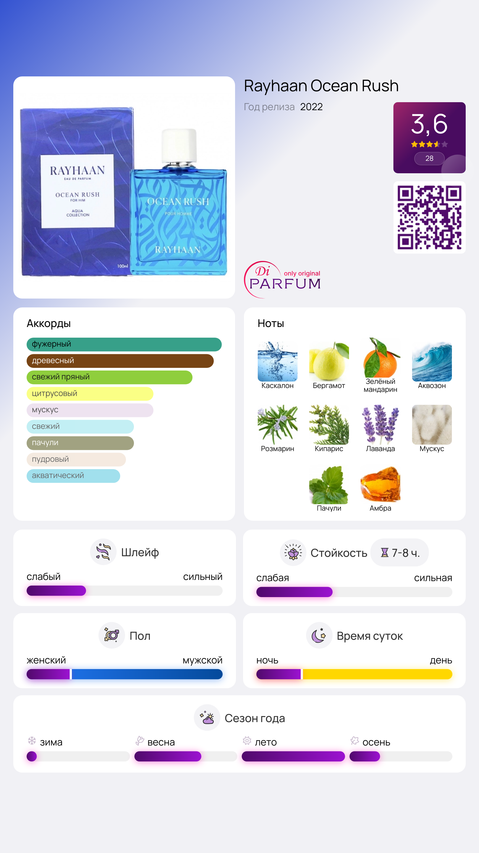 Ocean Rush от Rayhaan – это ароматическая акватическая композиция для мужчин, выпущенная в 2022 году. Этот парфюм принадлежит к Aqua Collection и представляет собой свежий и современный аромат. В верхнихNotes вы найдете каскалон, бергамот и зеленый мандарин, которые создают взрыв бодрости и энергии.