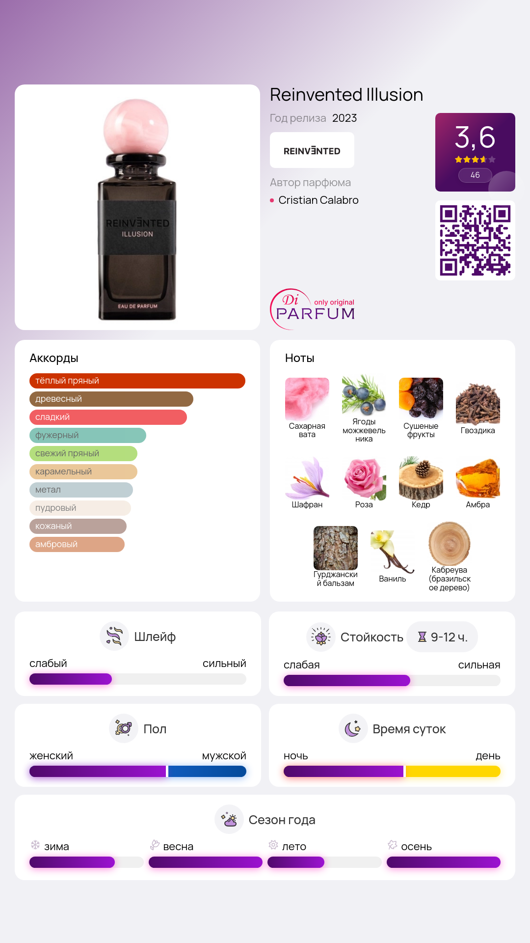 Фантомный аромат-иллюзия под названием Reinvented Illusion стал частью первой коллекции нишевого итальянского бренда, в которую вошли четыре уникальные композиции. Все флаконы имеют одинаковый дизайн: строгие формы, темное стекло и круглая крышка, а на этот раз гладкий, тяжелый шар переливается розовым перламутром.