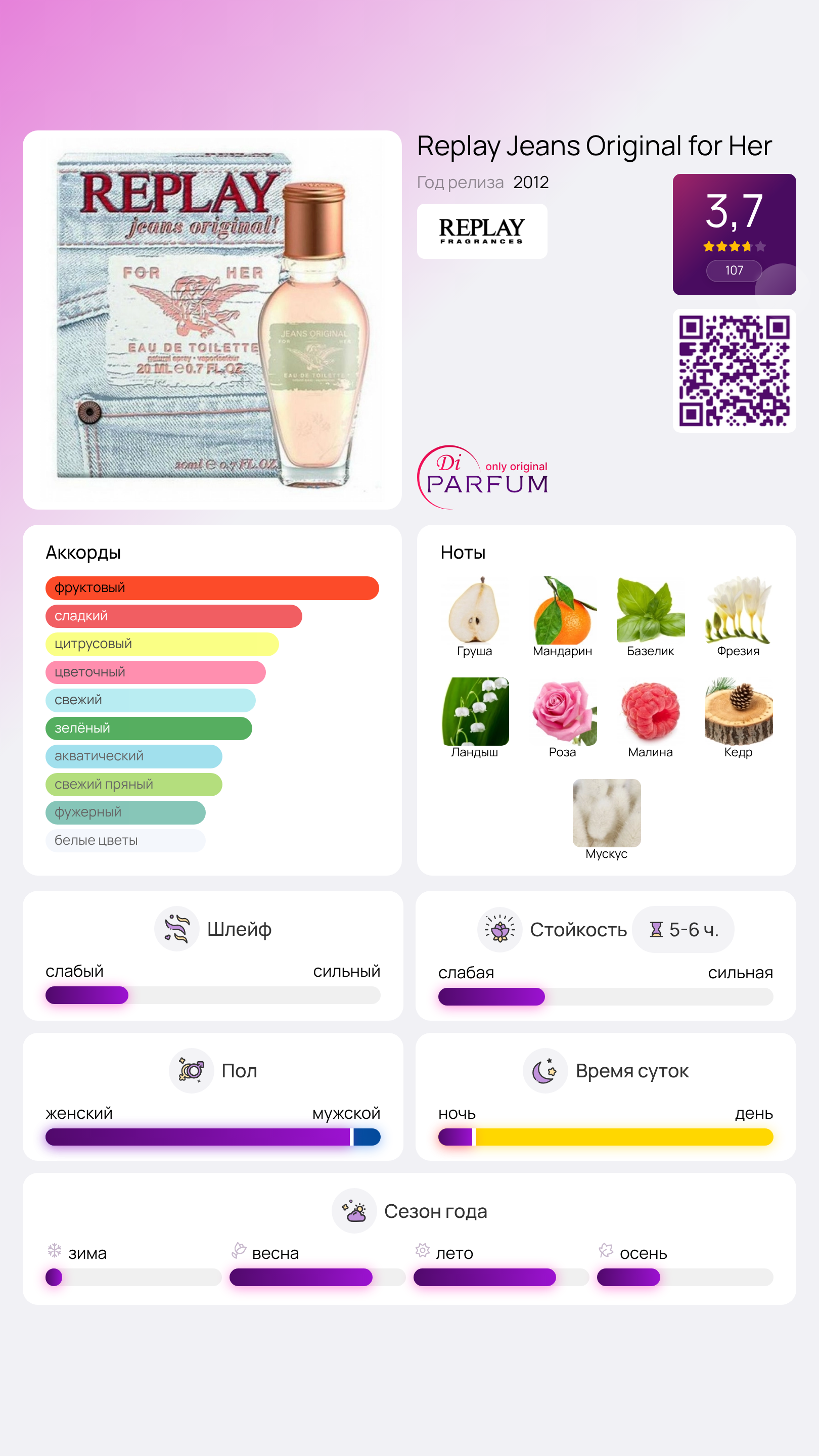 Итальянский молодежный бренд поставил перед собой задачу создать уютный повседневный аромат, который не требует лишних усилий, а просто создает атмосферу уюта. Таким ароматом стал Replay Jeans Original for Her. Это не дань уважения текстильному дениму, с которым компания традиционно работает, создавая современные тренды, а особый стиль "casual" в парфюмерии.