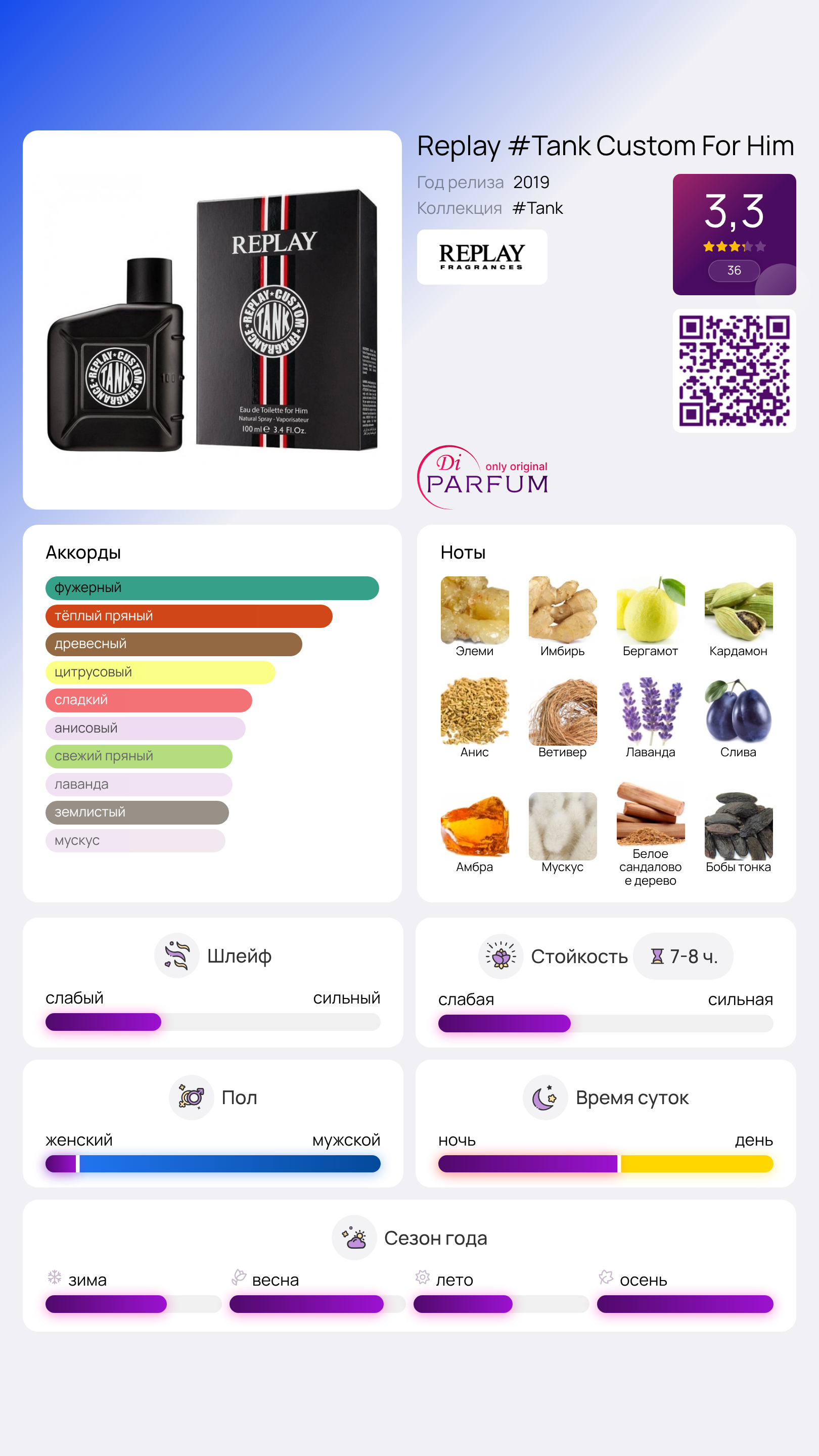 Аромат Replay #Tank Custom For Him представляет собой уникальное сочетание фужерных и древесных нот, воплощая в себе современную парфюмерию для города. Его вдохновение пришло от индивидуализированного мотоцикла, что символизирует преображение стандартного объекта в нечто исключительное. Указание на индивидуальный подход отражается уже в названии.