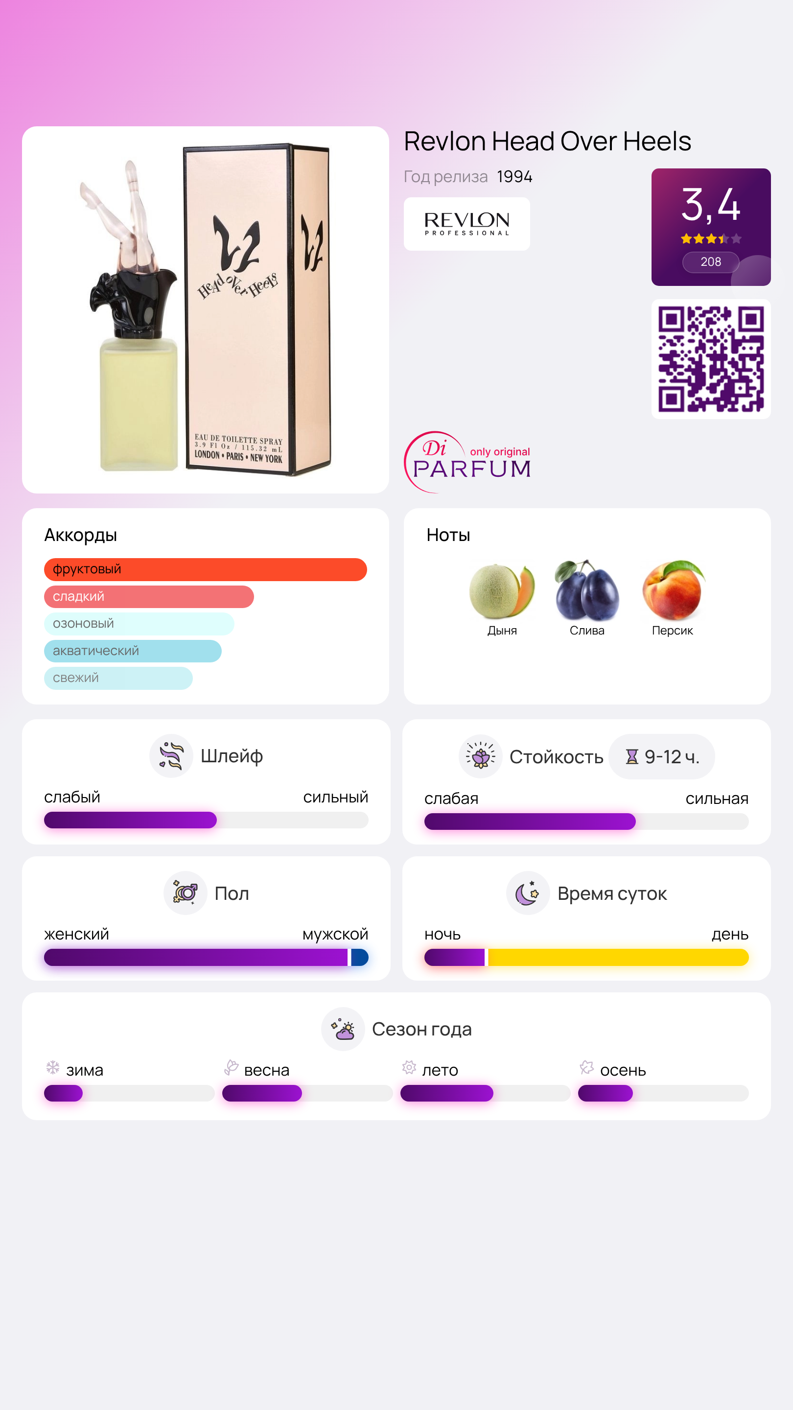 Страной его создания стал необычный флакон, оформленный в виде изящных женских ног, что подчеркивает игривое настроение этого аромата. Свежий букет цветочно-фруктовых запахов Revlon Head Over Heels наполнен яркими нотами дыни, сладковато-кислыми акцентами персика и классическими оттенками розы. В эту прекрасную композицию удачно вплетаются пряные ноты гвоздики и кедра.