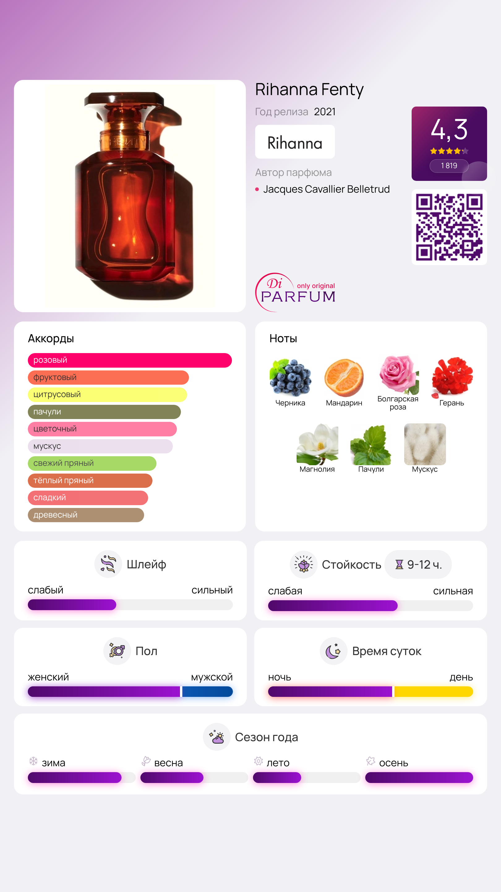 В верхних нотах вас приятно удивят яркие акценты черники и танжерина, создавая свежую и жизнерадостную атмосферу. Затем в раскрытии аромата появляются изысканные цветочные ноты болгарской розы и герани, которые добавляют чувственности и женственности. Завершает композицию глубокий шлейф из пачули и мускуса, придавая аромату стойкость и загадочность.