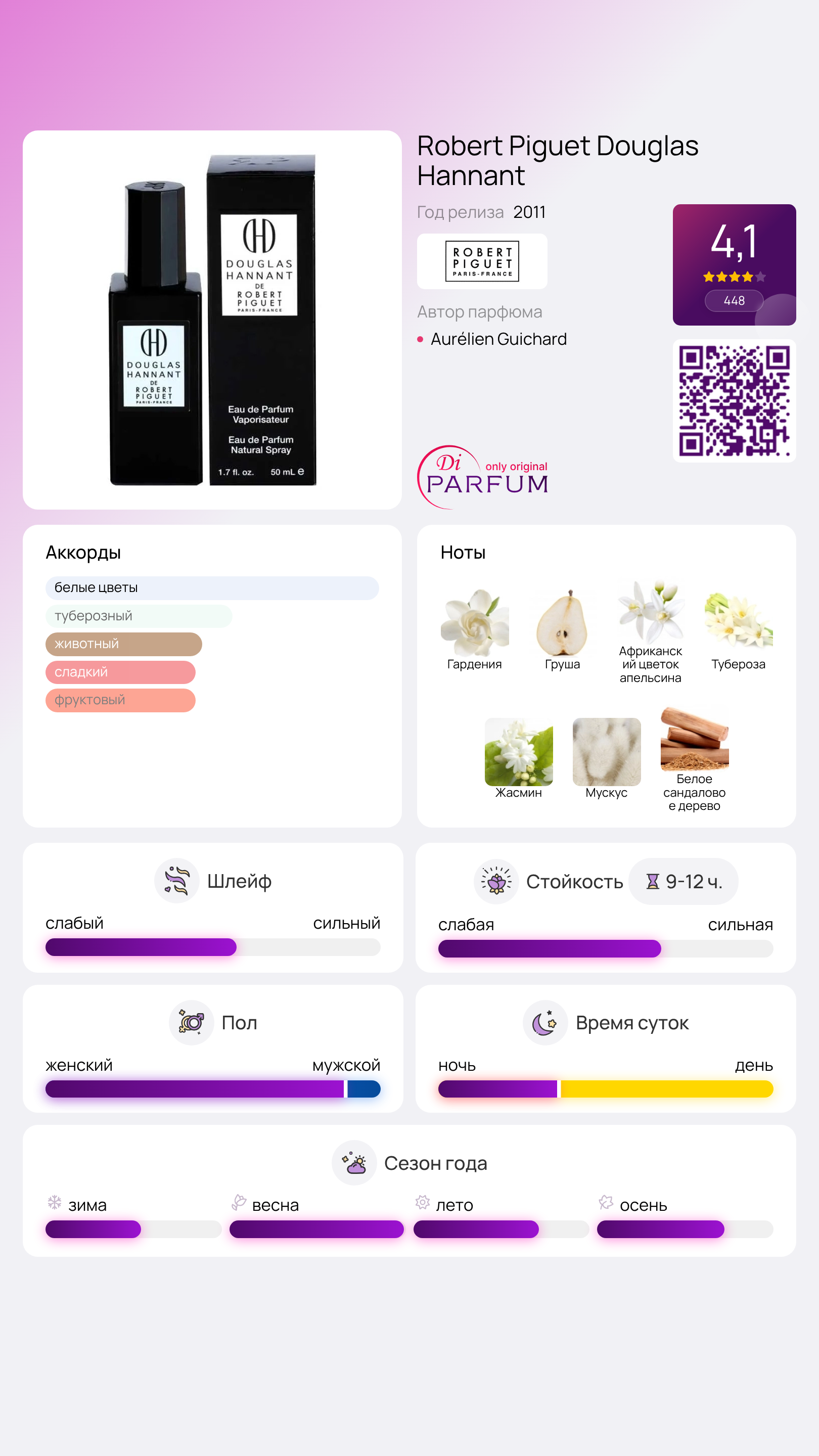 Этот изысканный и стильный аромат был создан под впечатлением от достижений высокой моды и выдающегося кутюрье, который сформировал стиль нашего времени. Парфюм Douglas Hannant от Robert Piguet окутывает хозяйку аурой роскоши, шика и гламура.