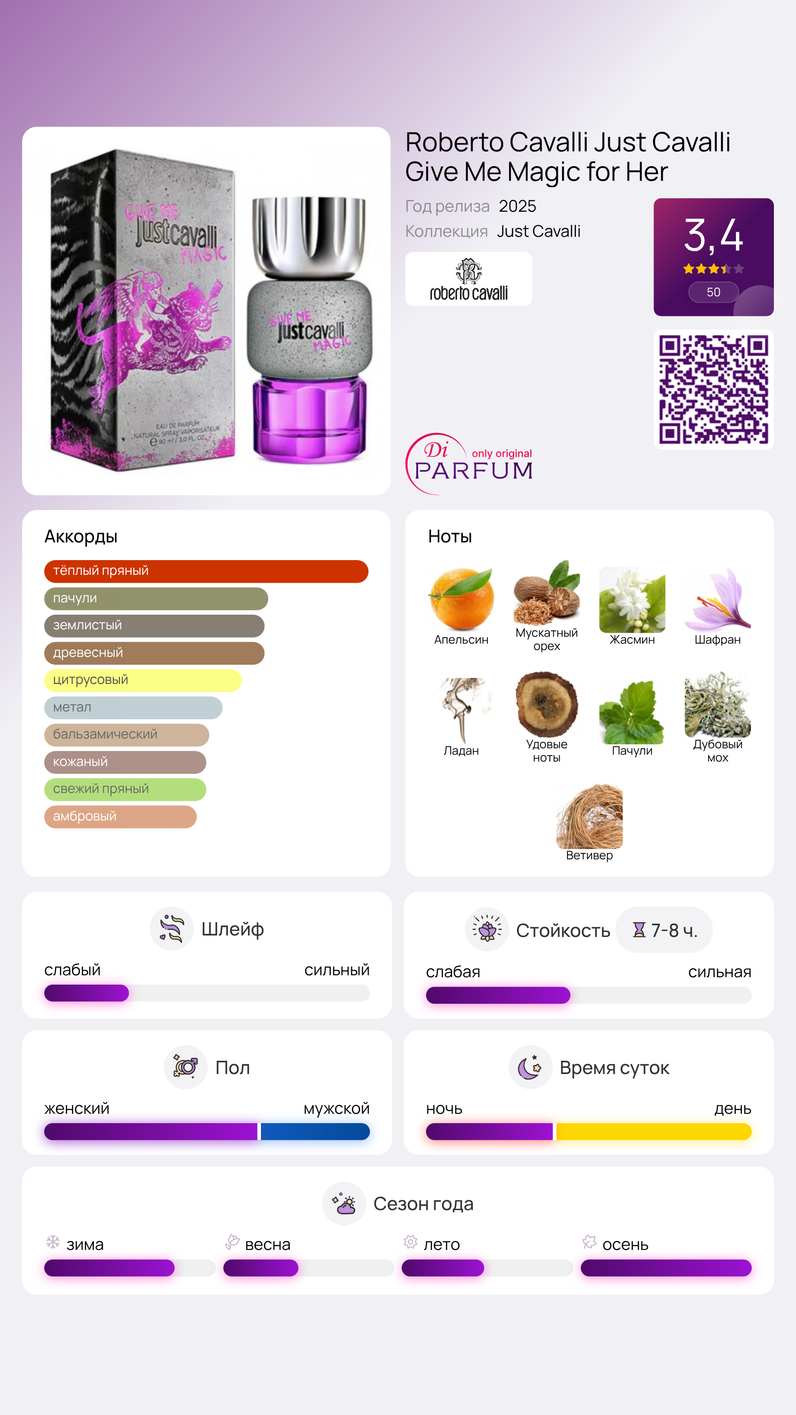 Just Cavalli Give Me Magic for Her от Roberto Cavalli — это восточно-древесный аромат для женщин, который был представлен в 2025 году. Эта новая парфюмерная композиция создает утонченный и запоминающийся аромат, сочетая в себе теплые пряности, светлые цветочные акценты и древесные ноты, которые придают ей сложную ароматическую глубину.