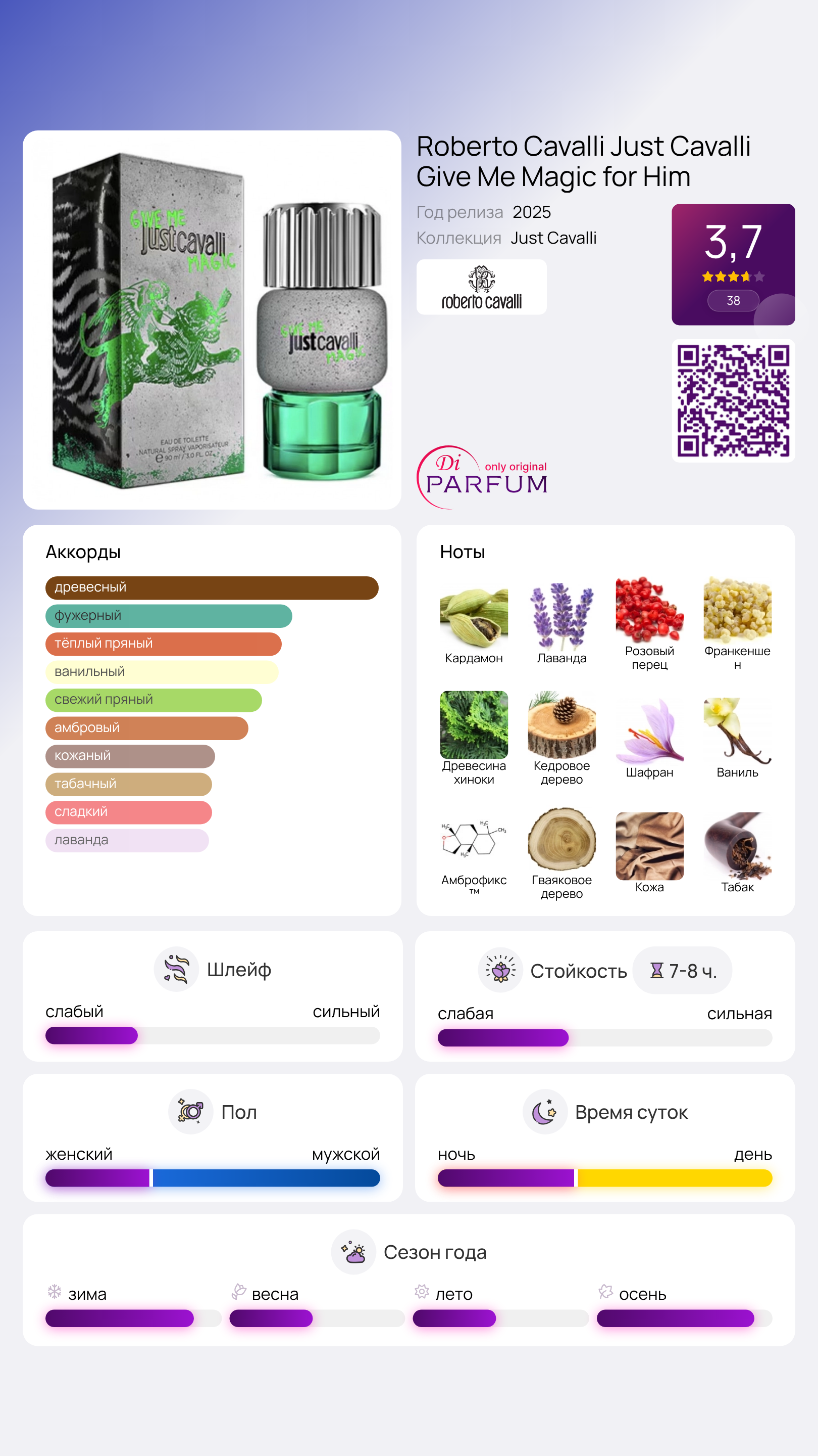Just Cavalli Give Me Magic for Him от Roberto Cavalli - это древесно-пряный аромат для мужчин, который был представлен в 2025 году. Он сочетает в себе яркие и живые ноты, создавая неповторимый шлейф, который привлечет внимание. Начальные ноты аромата включают розовый перец, лаванду и кардамон, в то время как сердце раскрывается богатством олибанума, дерева хиноки, кедра и шафрана.