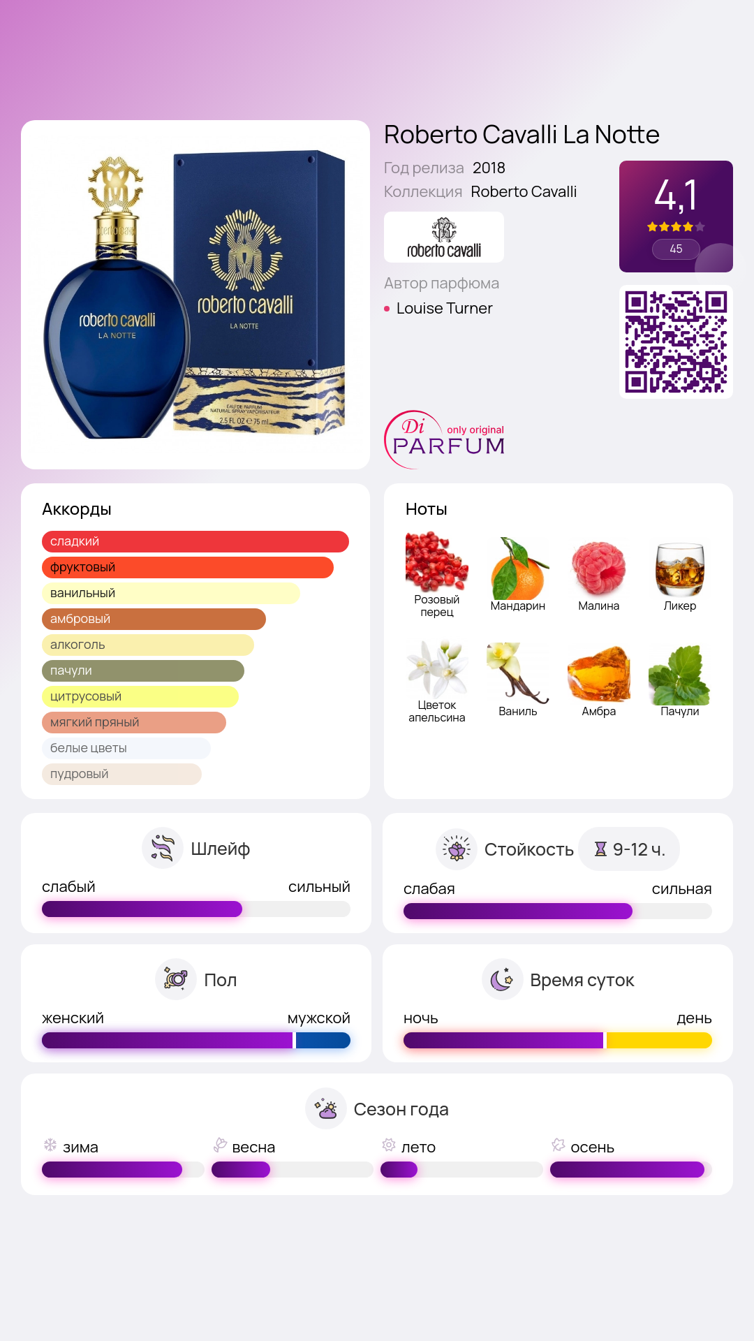 Roberto Cavalli La Notte от Roberto Cavalli – это восточно-цветочный аромат для женщин, выпущенный в 2018 году. Автором композиции является парфюмер Louise Turner. Аромат открывается выразительными нотами розового перца и мандарина, плавно переходя в сердечные ноты малины, ликера и апельсинового цвета. Завершает композицию обворожительная база из ванили, амбры и пачули.